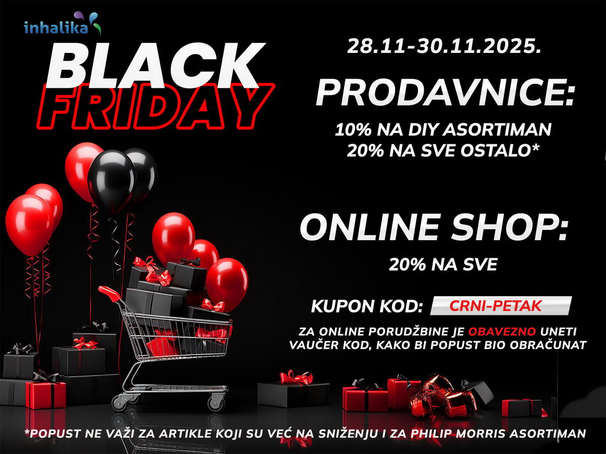 - na sajtu online prodavnice, kompletan asortiman je dostupan sa 20% popusta. Da bi ostvarili popust, potrebno je da unesete kod crni-petak u polje za kupon kod tj. vaučer. Vaučer se unosi u poslednjem koraku poručivanja, pre nego unesete svoju adresu. UKOLIKO SE VAUČER NE UNESE POPUST NEĆE BITI OBRAČUNAT!
