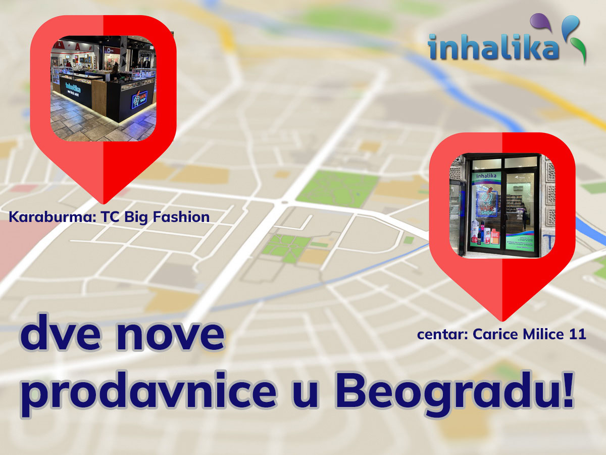 Inhalika mreža vape prodavnica je od novembra 2022. godine bogatija za dva nova, reprezentativna objekta. Sada nas možete pronaći u centru Beograda (ulica Carice Milice broj 11) i u tržnom centru Big Fashion na Karaburmi (nivo 1).