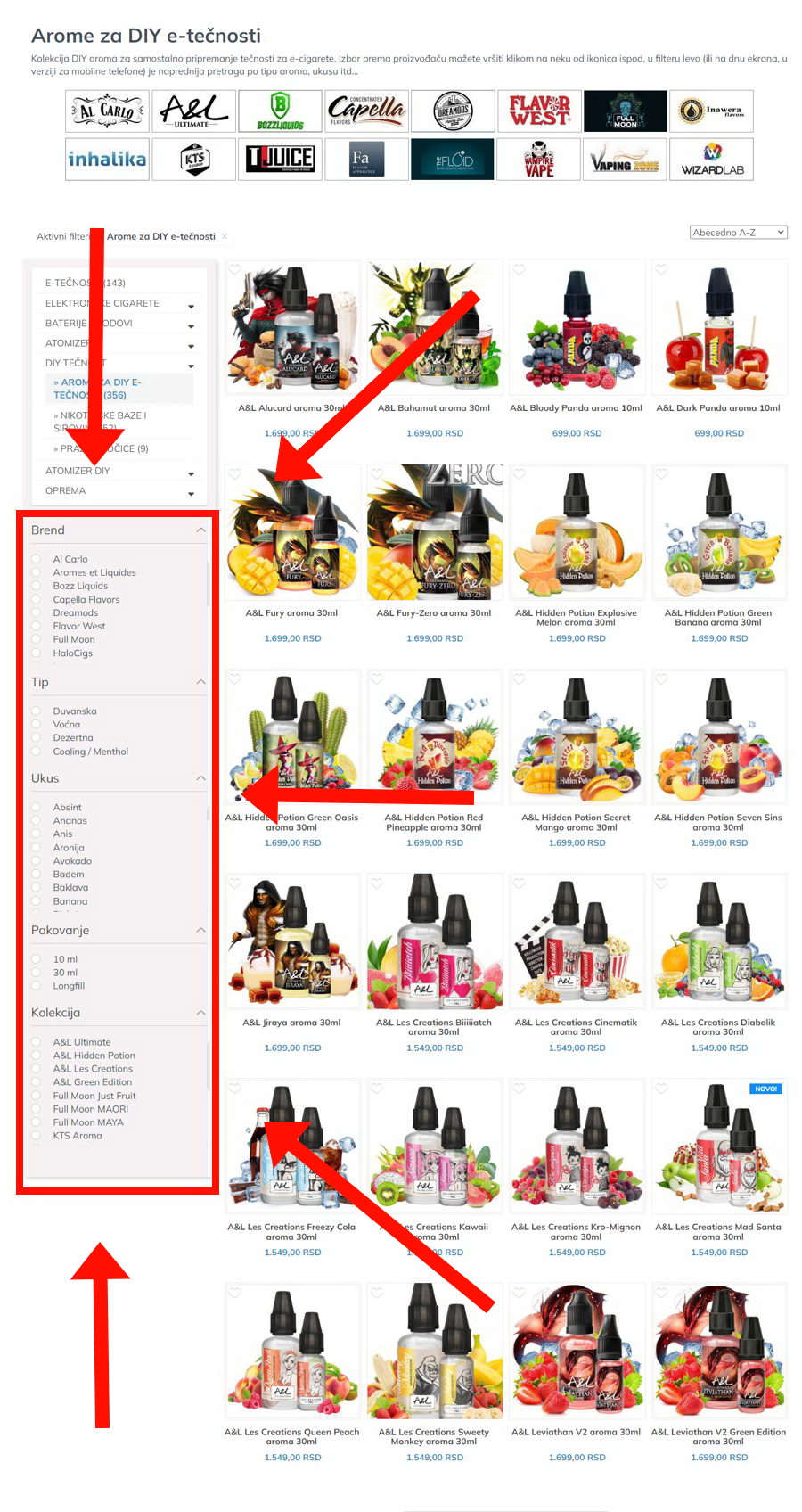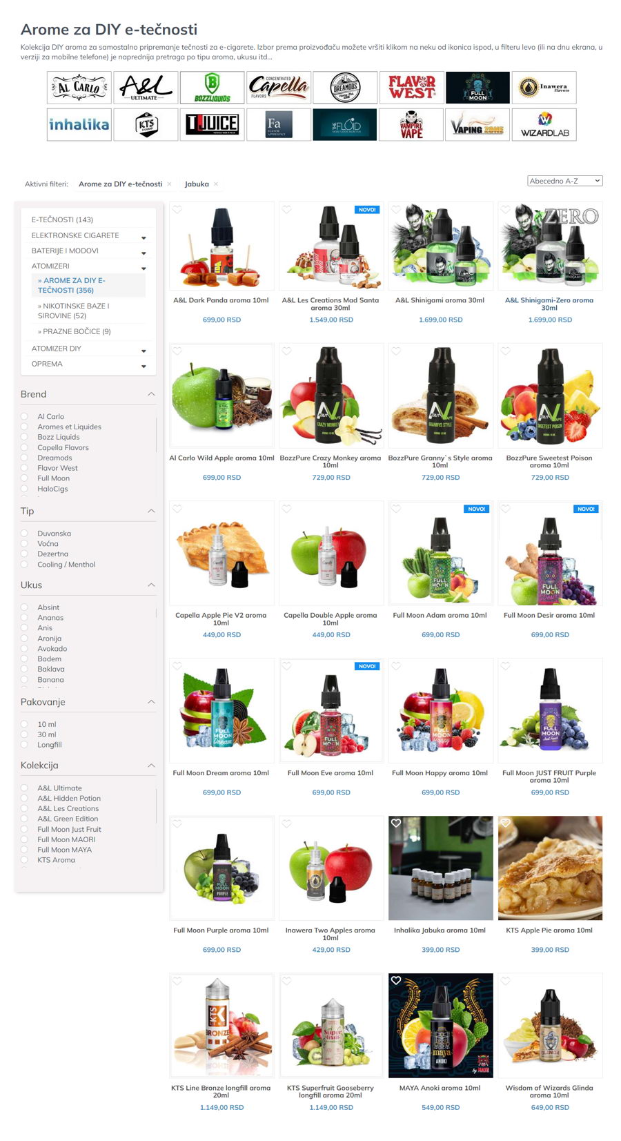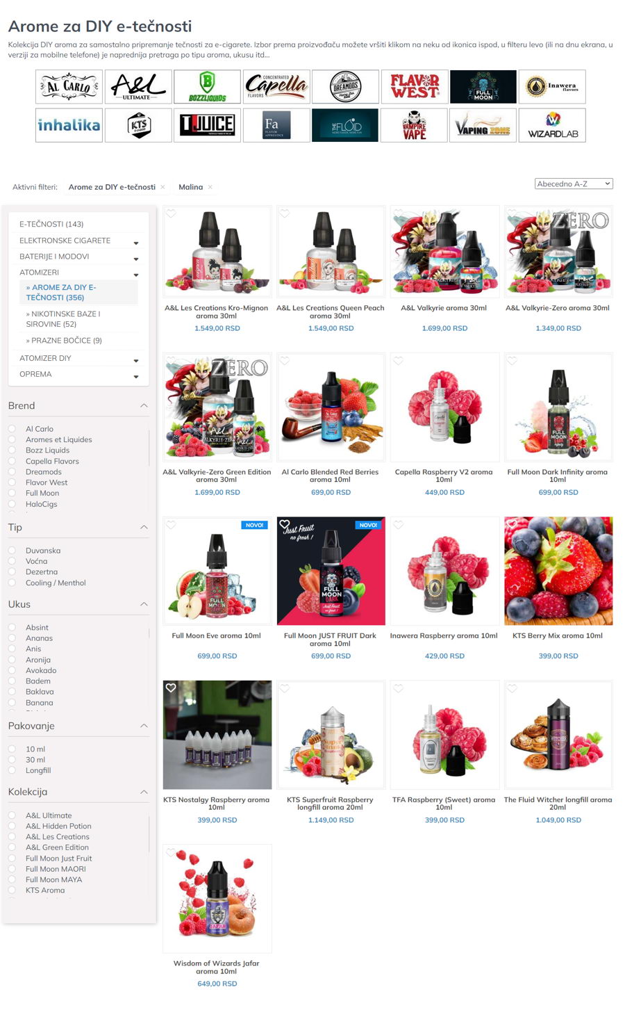 Na primer, ovakav ekran se dobije kada se unutar kategorije AROME ZA DIY tečnosti u filteru UKUS klikne na "malina":
