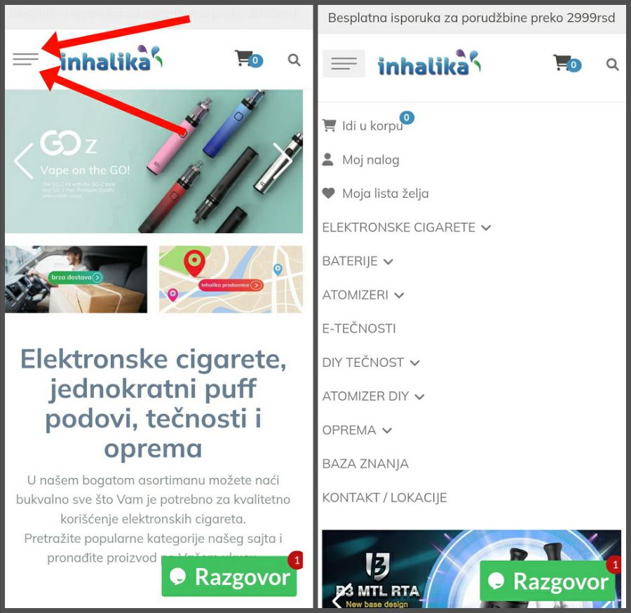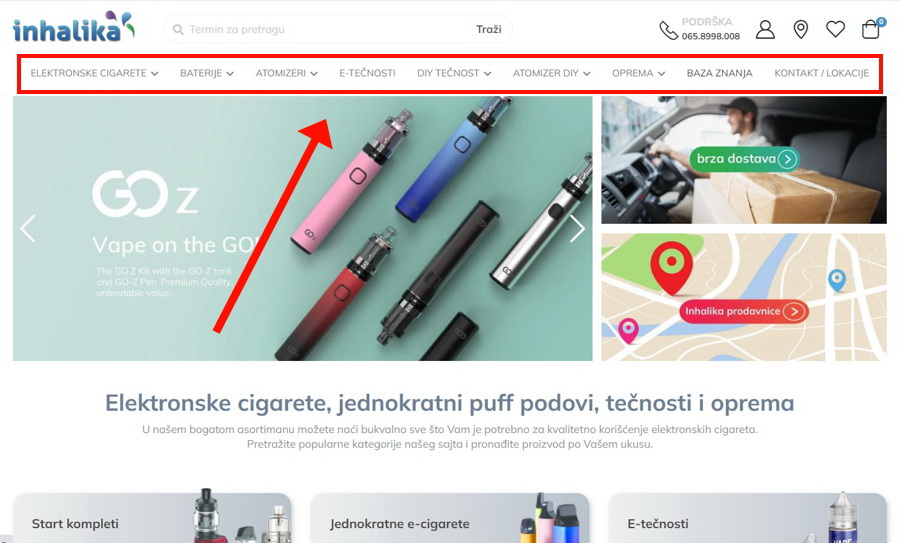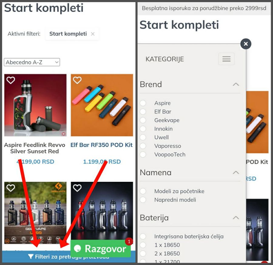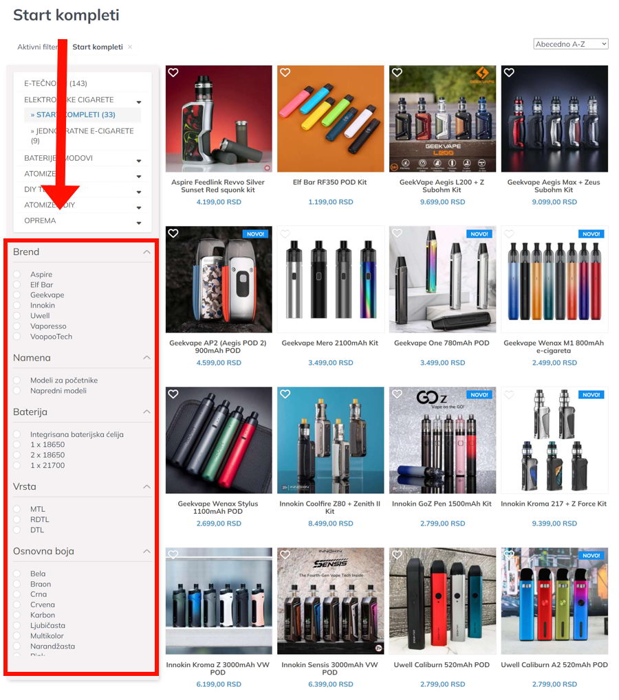 U naprednom filteru sa leve strane (na slici uokviren crvenom bojom) možete suziti pretragu prema parametru koji Vam je bitan. Dostupno je filtriranje prema brendu, nameni (za početnike ili napredniji model), bateriji (integrisana ili izmenljiva baterija), vrsti tj. načinu korišćenja (MTL, RDTL ili DTL) i prema osnovnoj boji uređaja.