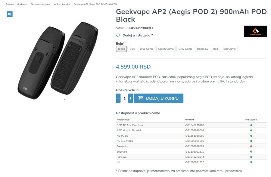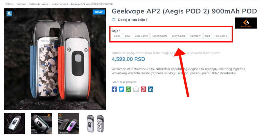 Važna novina koju donosi ova platforma je da se za svaku varijaciju sada prikazuje posebna slika. Na primer, za Geekvape AP2 POD: