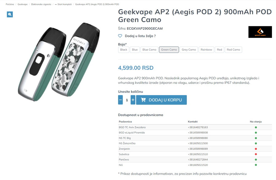 Prikazana je dostupnost po radnjama za BLACK verziju ovog uređaja. Ako kliknemo na GREEN CAMO, sajt će nam prikazati sliku kako uređaj izgleda u toj boji, a ispod je dostupnost te boje po radnjama: