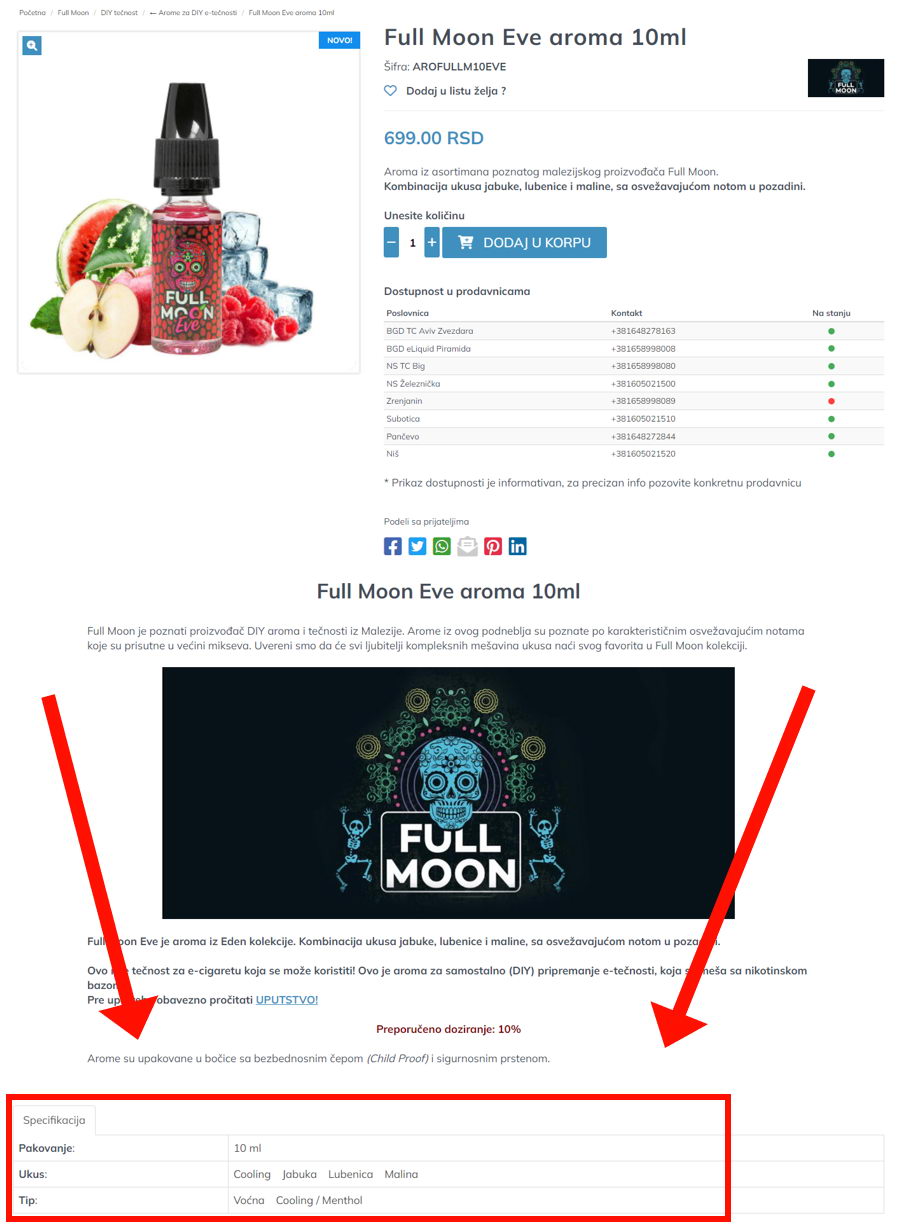 Kada otvorite stranicu nekog artikla, u dnu opisa se nalazi njegova specifikacija prema atributima za koje postoji filtriranje. Otvorili ste npr. stranicu za Full Moon Eve aromu i to onda izgleda ovako: