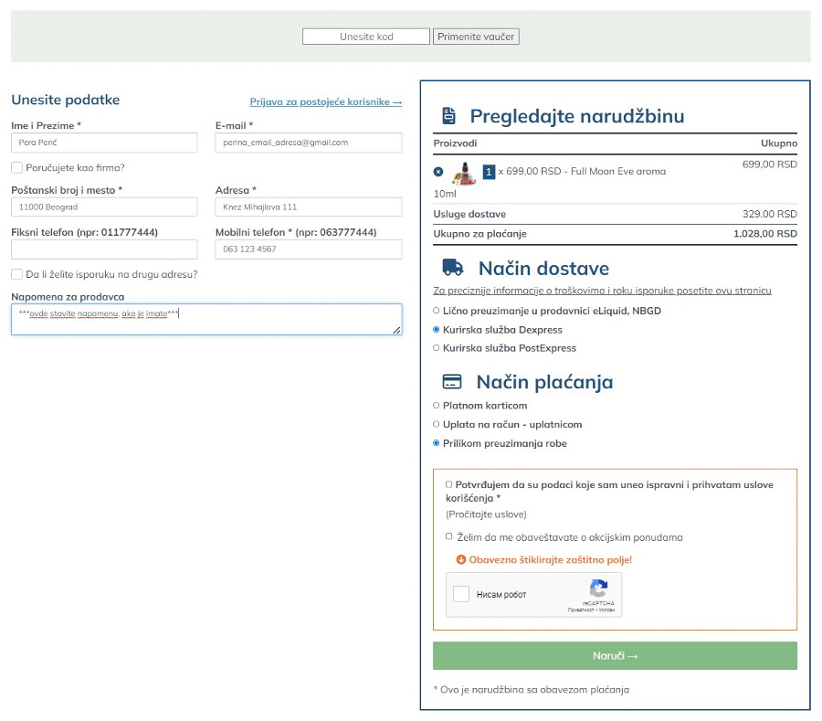 Nakon što kliknete na NARUČI, pojavi se ekran u kojem unesete sve podatke i potvrdite porudžbinu. Ostaje samo da strpljivo sačekate kurira sa Vašim paketom.