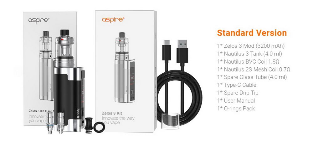 Najdugovečniji model u svetu atomizera sa fabričkim glavama je popularni Nautilus kompanije Aspire. Treća verzija ovog atomizera (Nautilus 3) je ovde uparena sa kvalitetnom Zelos 3 baterijom kapaciteta 3200mAh, u kombinaciji jednostavnoj za korišćenje koja svojim performansama garantuje užitak kako apsolutnim početnicima tako i iskusnijim, naprednim vaperima.