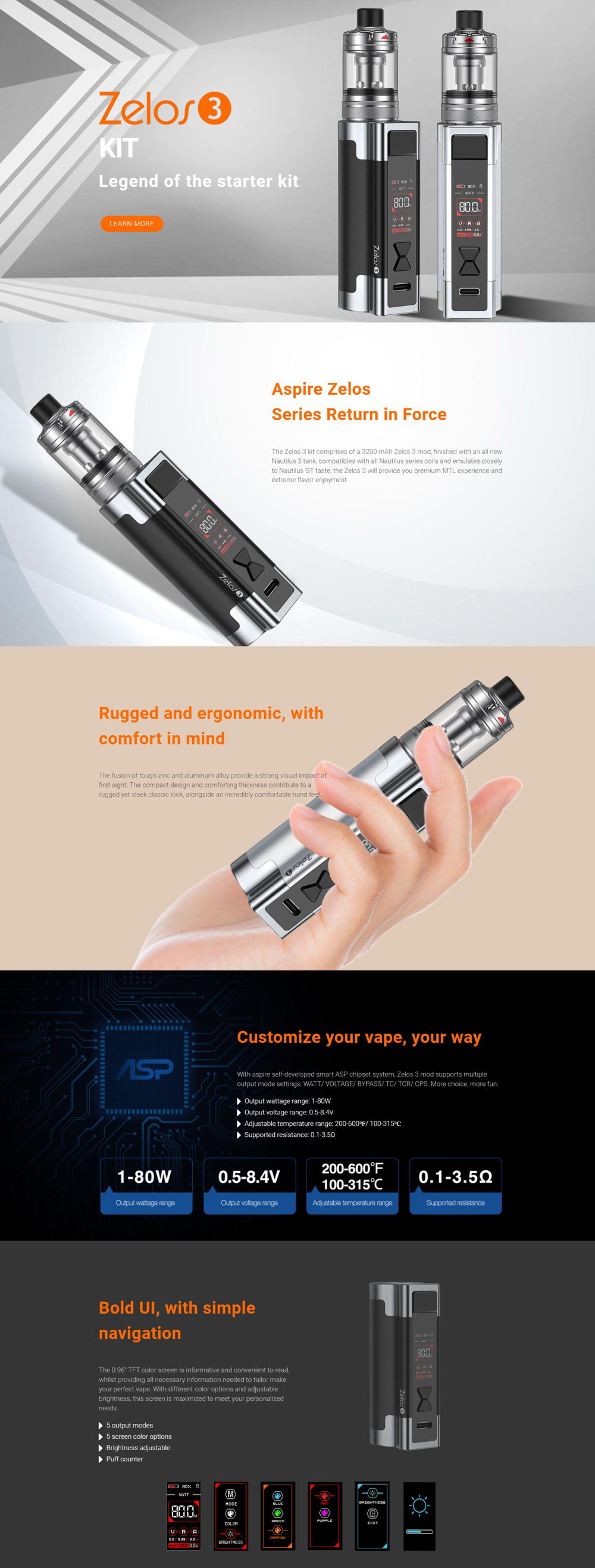 Zelos 3 je treća generacija popularne Zelos baterije kompanije Aspire. Za fukcionisanje ove baterije je zadužen poznati ASP elektronski čip, koji karakteriše preciznost i pouzdanost. Zelos 3 veoma lepo leži u ruci i jednostavna je za korišćenje. Na kolor ekranu visoke rezolucije su prikazani parametri bitni za rad uređaja.