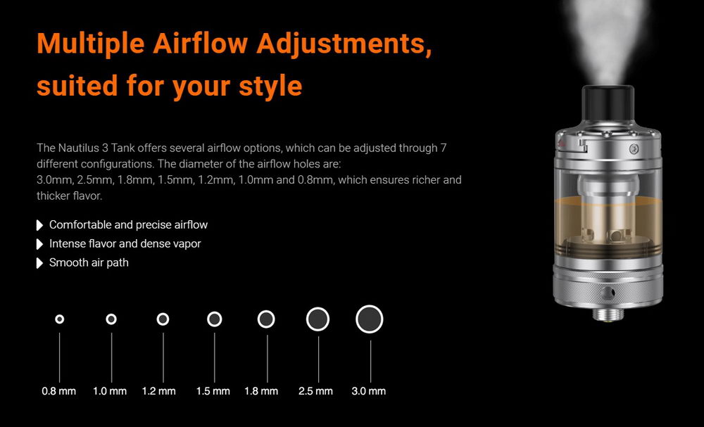 Ovo je treća generacija popularnog Nautilus atomizera. Unapređen sistem za punjenje tanka i visok kvalitet izrade čine ga jednom od najboljih opcija za standardne MTL/rDTL korisnike. Nautilus 3 daje mogućnost veoma preciznog podešavanja protoka vazduha, a tu je i veoma praktičan sistem zaštite kod promene zamenskih glava: kada se zamenska glava izvadi, ventil zatvori otvore i sprečava da tečnost iscuri iz tanka.
