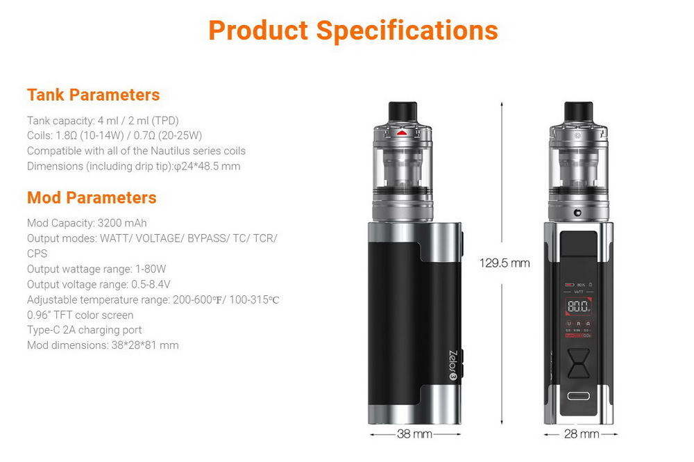 Najdugovečniji model u svetu atomizera sa fabričkim glavama, popularni Nautilus, u kombinaciji sa kvalitetnom Zelos 3 baterijom kapaciteta 3200mAh. Komplet veoma jednostavan za korišćenje koji svojim performansama garantuje užitak kako apsolutnim početnicima tako i iskusnijim, naprednim vaperima.