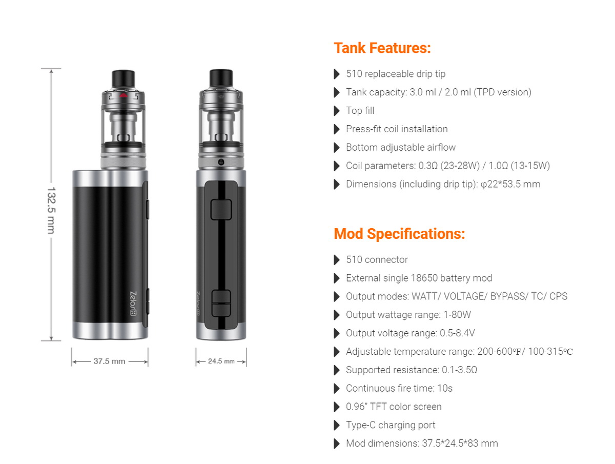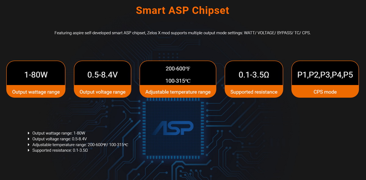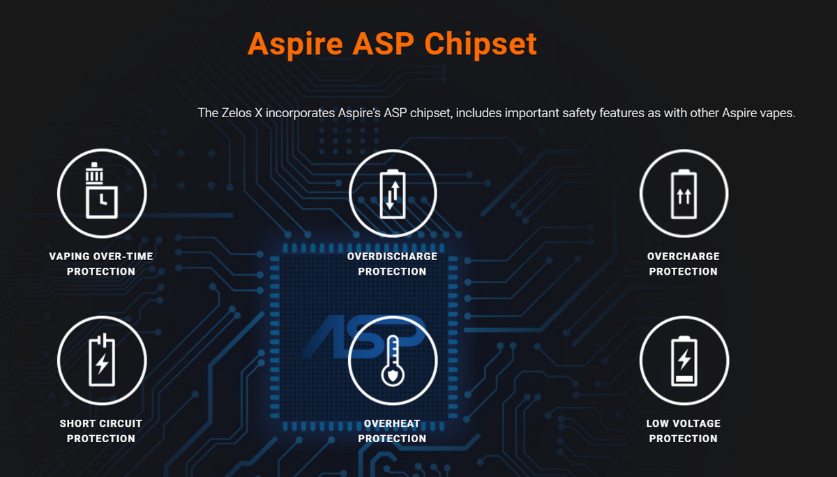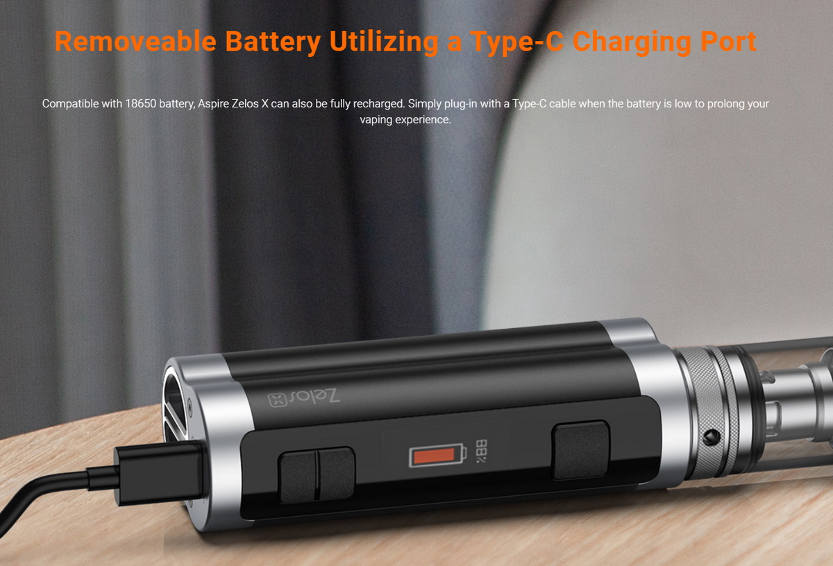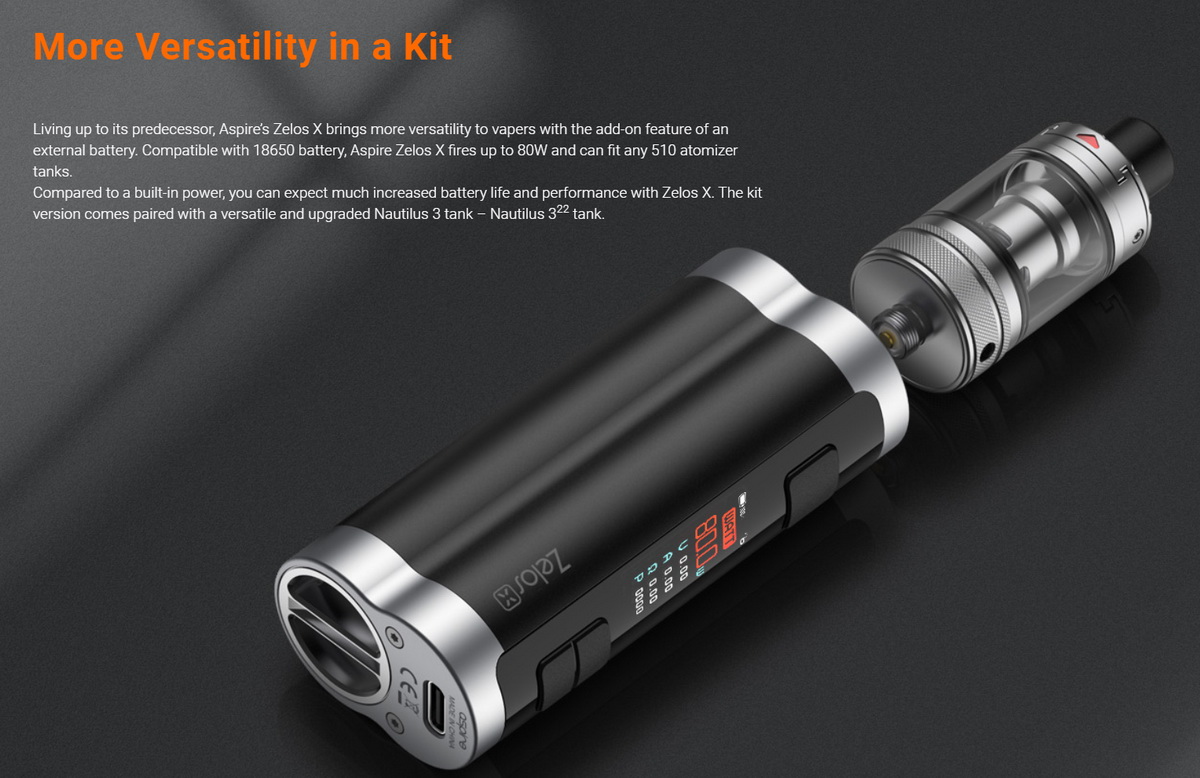 Zelos X je baterijski mod koji pokreće izmenljiva Li-ion 18650 baterija. Uz visok kvalitet izrade koji je karakterističan za sve Aspire uređaje, Zelos X donosi i fenomenalan ergonomski dizajn. Stariji vaperi će prepoznati da Zelos X oblikom veoma (možda i više nego što bi smeo) podseća na baterijske modove nemačke high-end kompanije Dicodes. Dicodes modovi su svoju višegodišnju popularnost na svetskom nivou velikim delom stekli i zbog ovakvog dizajna, zbog kojeg ovi uređaji veoma lepo leže u ruci i prijatni su za korišćenje.