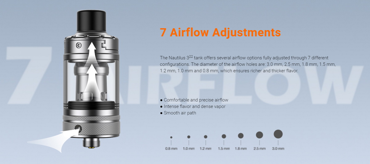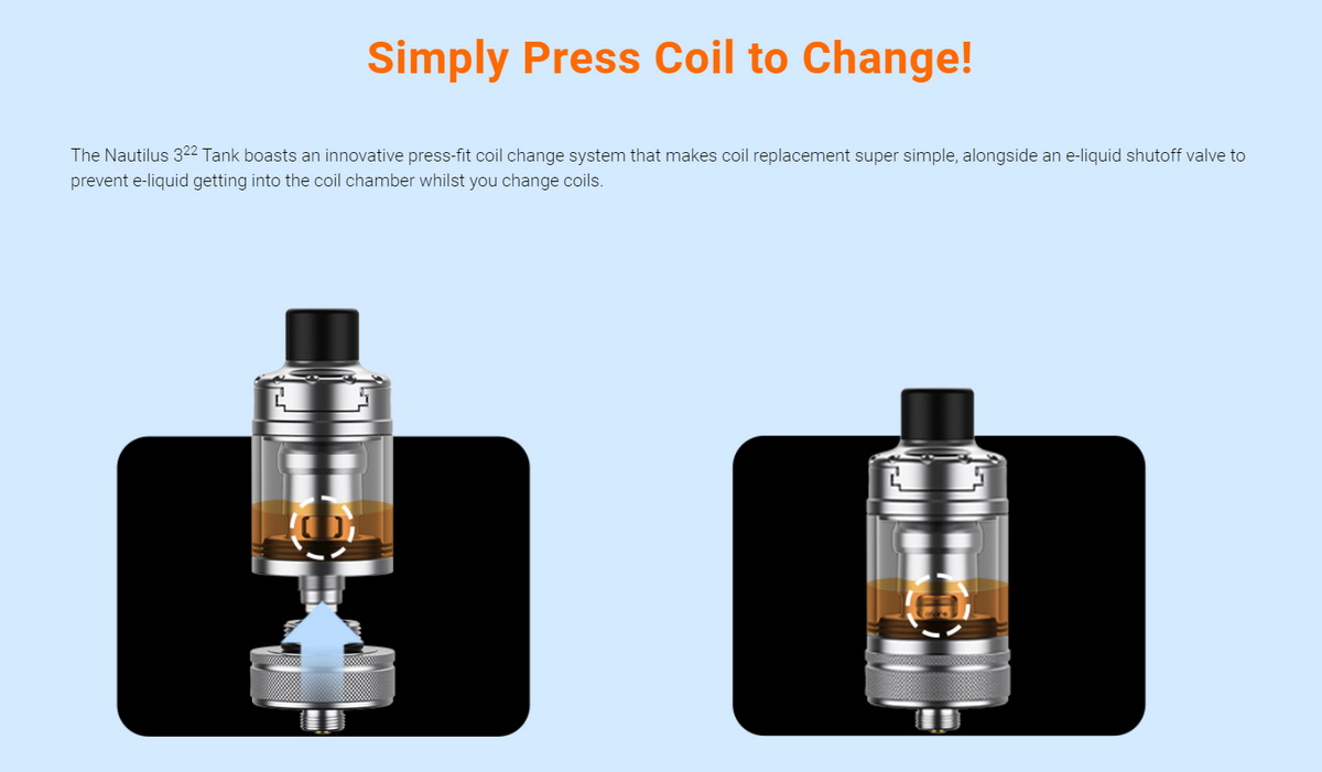 Nautilus 3²² atomizer koristi dobro poznate i popularne Nautilus zamenske glave. Nautilus kolekcija zamenskih glava pokriva veoma širok spektar korisnika, od baš tesnog MTL protoka vazduha do restriktivnog DTL protoka.