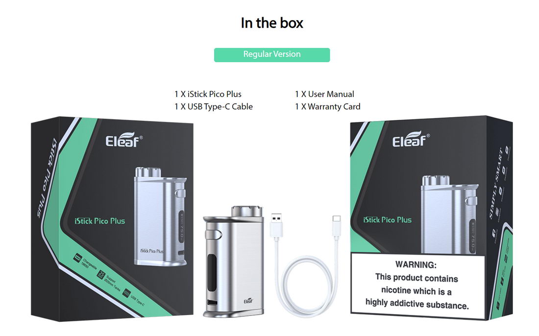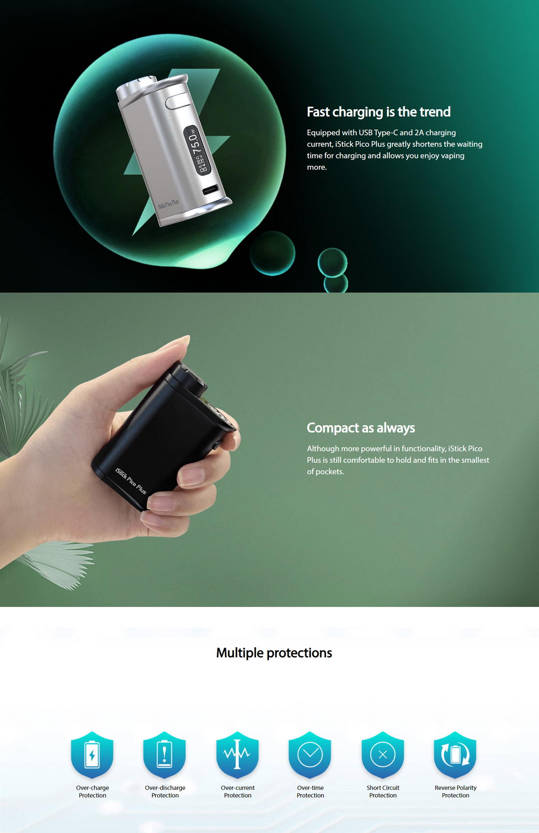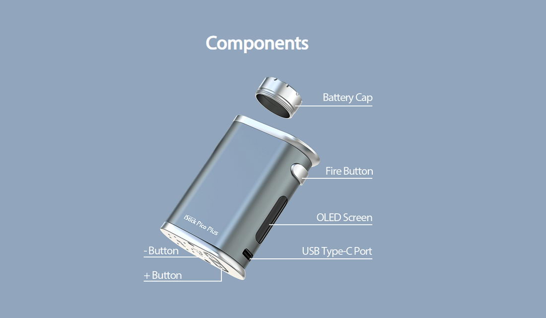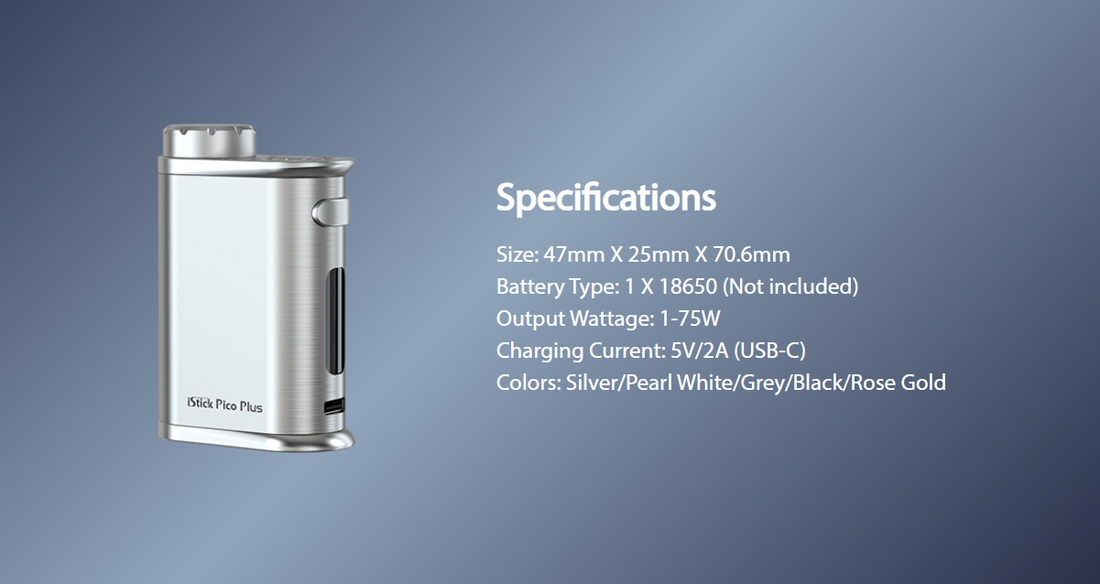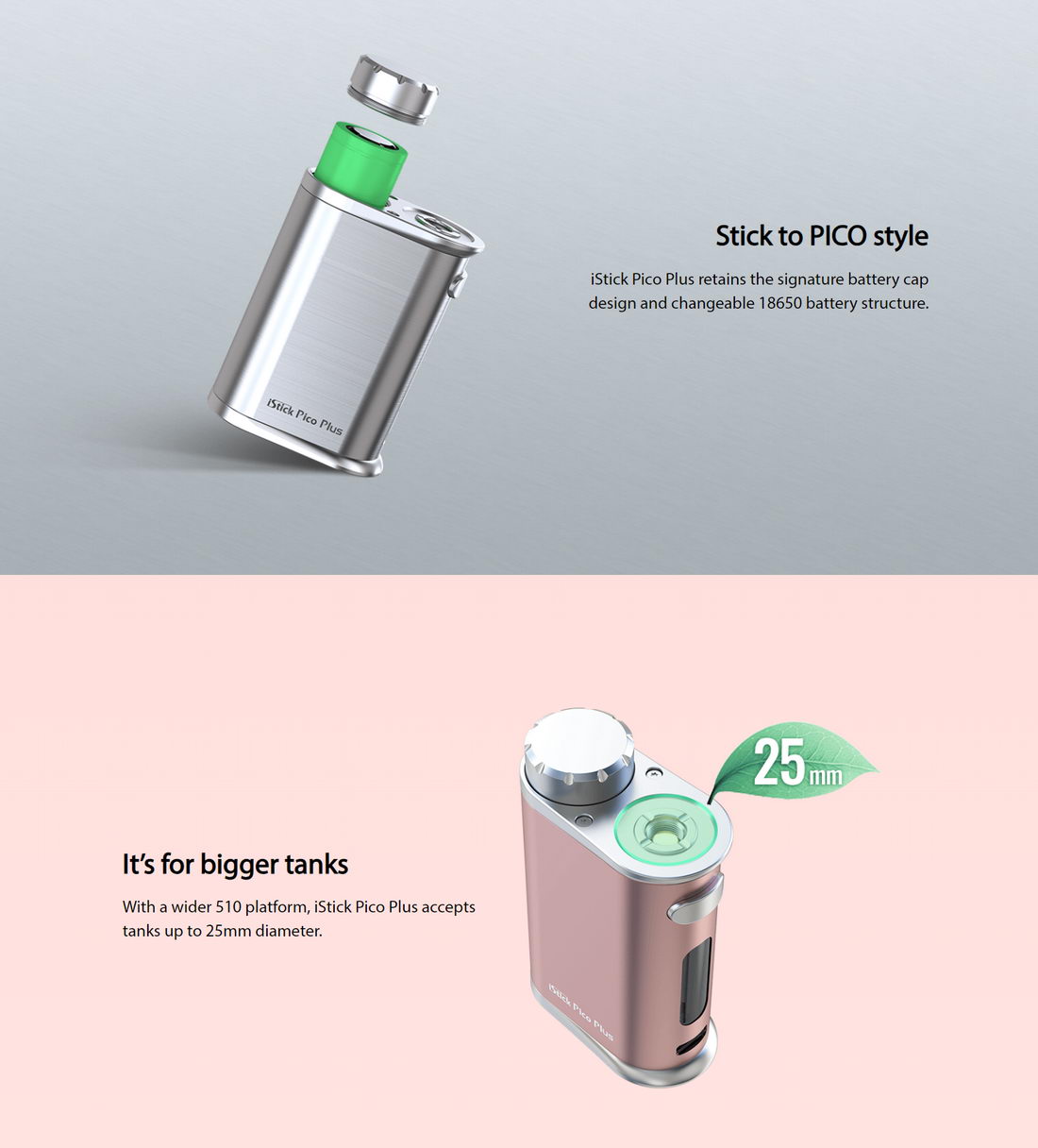 Plus verzija čuvenog Eleaf iStick Pico moda: istih performansi i gotovo identičnog izgleda, sada sa podrškom za atomizere do 25mm širine. Pico Plus pokreće jedna izmenljiva 18650 Li-ion baterija.