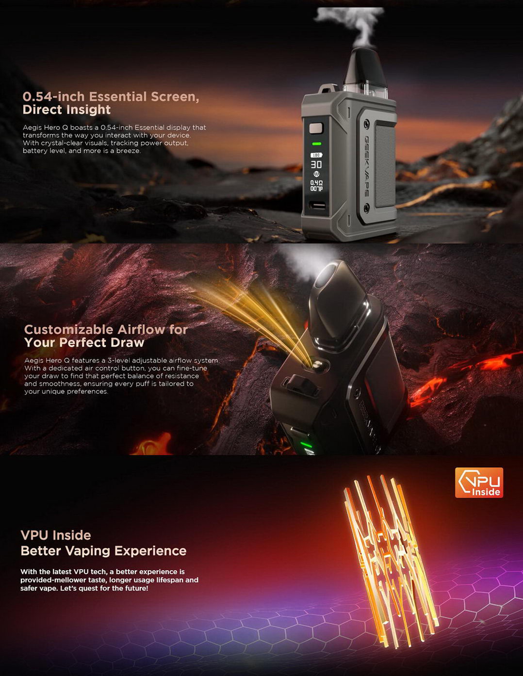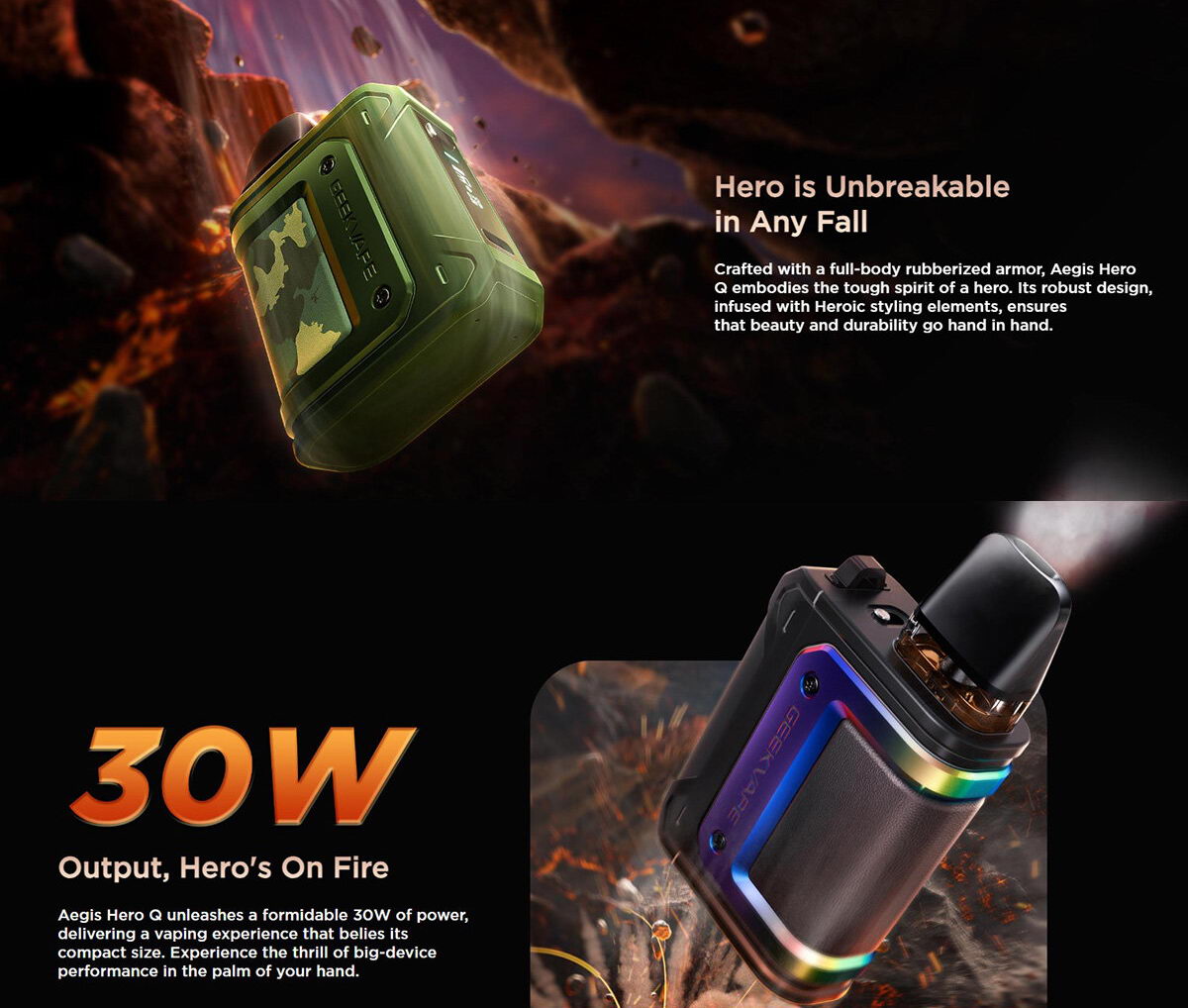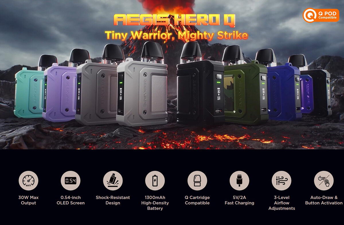 Aegis uređaji kompanije Geekvape su karakterističnog dizajna i otporniji na habanje i spoljašnje uticaje. Hero Q je novi POD model u ovoj kolekciji, koristi Geekvape Q POD kertridže koji su kapaciteta 2ml ili 3ml a baterija je kapaciteta 1300mAh. Korisniku su na raspolaganju podešavanja protoka vazduha i izlazne snage, što sve skupa garantuje maksimalan užitak.