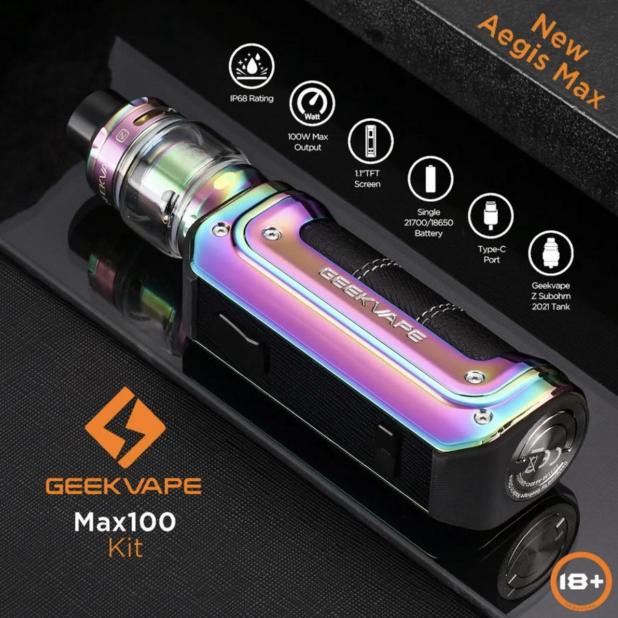 Komplet sastavljen od Geekvape Max100 baterijskog moda maksimalne snage 100W i Z Subohm 2021 atomizera kapaciteta 5.5ml, namenjen zahtevnijim korisnicima, za korišćenje uvlačenjem direktno u pluća (DTL).
