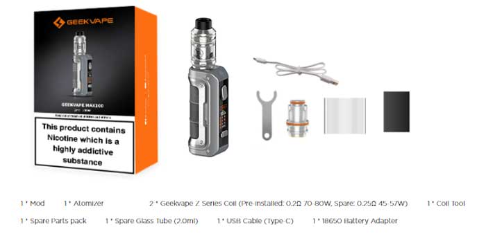 SADRŽAJ KOMPLETA: - Geekvape Max 100 TC/VW baterijski mod - Adapter za 18650 baterije - Alatka za skidanje maske uređaja - USB kabal - Z Subohm 2021 atomizer (sa instaliranom 0.2 oma zamenskom glavom) - 0.25 oma zamenska glava - Zamensko tank staklo (ravno) - Uputstvo za upotrebu