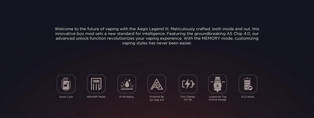 U Aegis kolekciji uređaja kompanije Geekvape, najviše je dual baterijskih modova. Legend 3 je najnoviji baterijski mod sa oznakom Aegis, pokreću ga dve Li-ion 18650 baterije. Otpornost na vodu, prašinu i udarce je ista kao kod prethodnog modela (L200 tj. Legend 2) i zadovoljava IP68 standard. Legend 3 donosi nekoliko sjajnih unapređenja, poput taktilnog otključavanja i novih režima rada. U ovom kompletu je uparen sa Z Fli atomizerom, naslednikom popularnog Zeus Subohm atomizera.