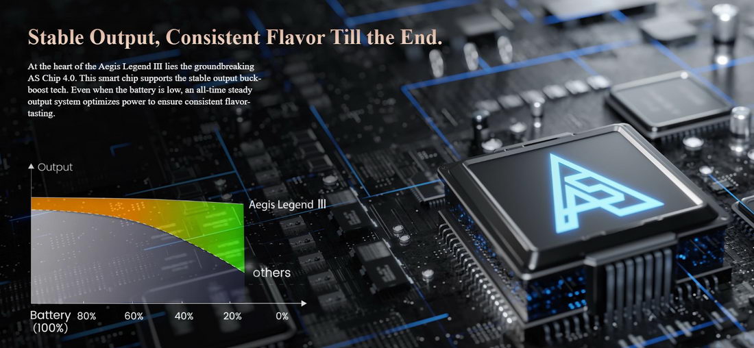 Aegis Legend 3 se pali na standardan način, sa 5 brzih klikova na prekidač. Za rad uređaja je zadužen poznati Geekvape AS čip, sada u verziji 4.0. AS 4.0 je dodatno unapredio stabilnost u radu što se najviše primeti kako se baterija prazni, jer je pad performansi minimalan.