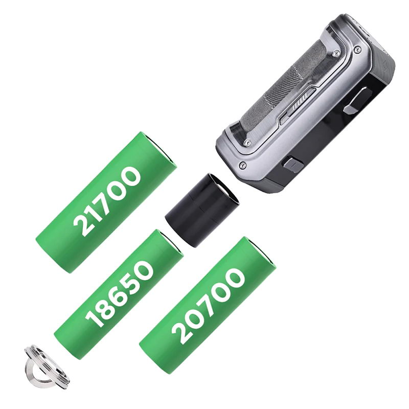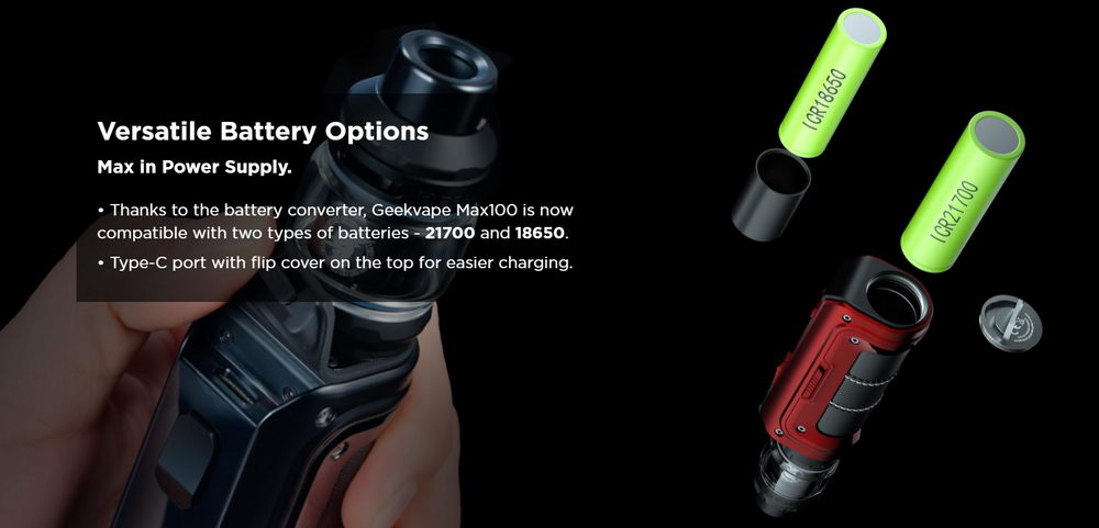 Geekvape Max100 pokreće jedna izmenljiva Li-ion baterija (nije deo kompleta, kupuje se zasebno). Podržani su 18650, 20700 i 21700 modeli. Baterija se postavlja odvrtanem poklopca na dnu moda. Za korišćenje 18650 baterije je neophodan adapter koji je deo kompleta. PREPORUKA je korišćenje isključivo kvalitetnih High-Rate baterija!