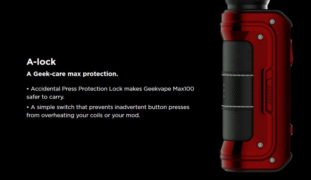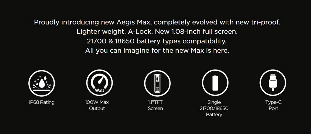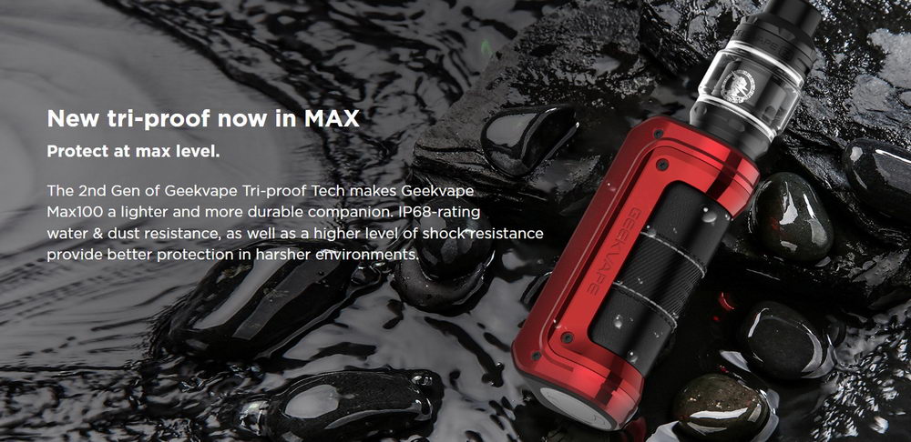 Max100 (Aegis Max 2) je naslednik popularnog 21700 baterijskog moda iz kompanije Geekvape, sa trostrukom otpornošću na spoljašnje uticaje. Manjih dimenzija i lakši nego prethodnik, ali je otpornost na uticaj vode, prašine i udaraca veća i zadovoljava IP68 standard.