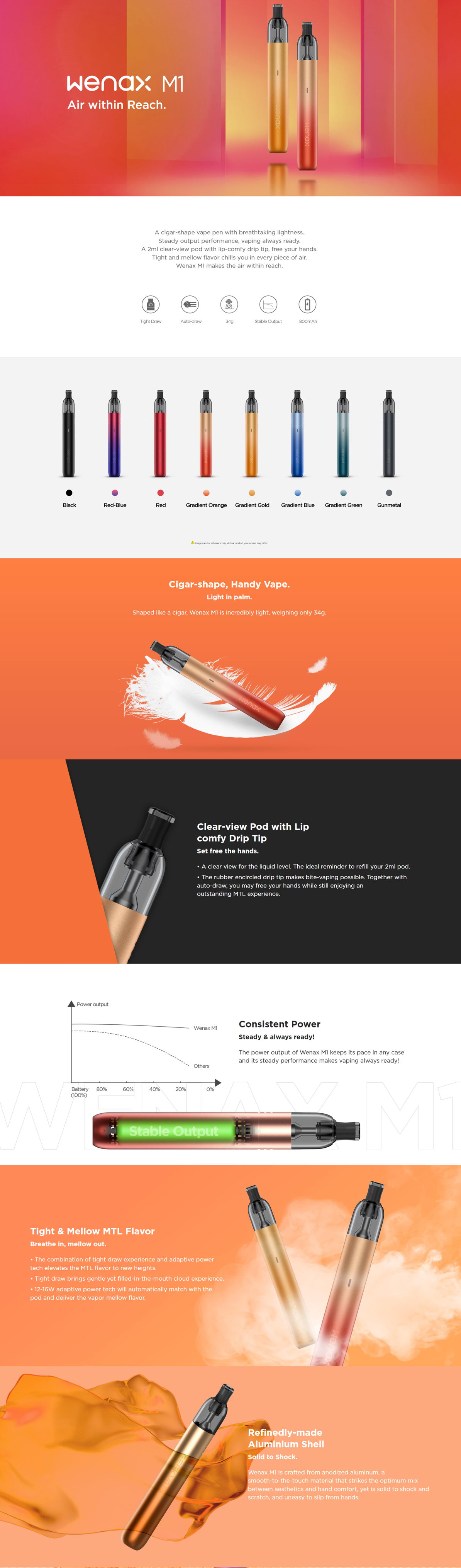 Telo M1 POD e-cigarete je izrađeno od aluminijuma pa je kompletan uređaj težak samo 34g. Kertridž ima kapacit od 2ml i u njemu je ugrađen grejač, a integrisana baterija je kapaciteta 800mah. Wenax M1 predstavlja sjajan izbor za korisnike koji traže jednostavan uređaj malih dimenzija, koji će pružiti dobru aromu i biti lak za korišćenje.