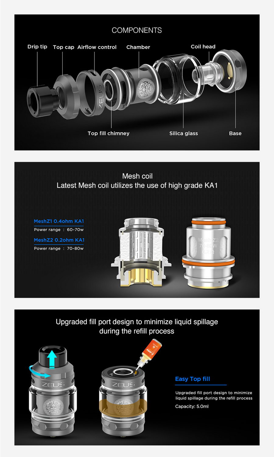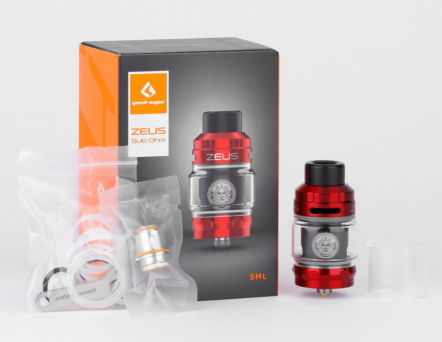 GeekVape Zeus Subohm atomizer. Prvi model u ovoj seriji koji koristi fabričke grejače, u isto vreme zadržavajući dobre osobine svojih prethodnika: dizajn koji sprečava curenje tečnosti i izraženu aromu. Predviđen za zahtevnije korisnike i korišćenje uvlačenjem direkt u pluća (DTL).