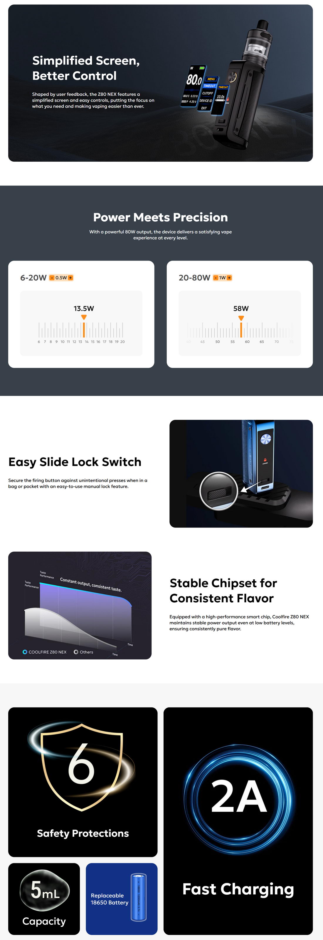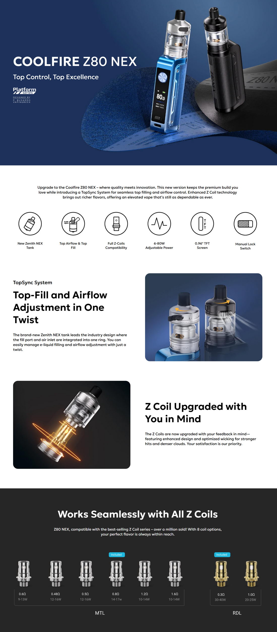 Moćan komplet iz Innokina namenjen kako iskusnim vaperima tako i početnicima koji traže kvalitetnu opciju za start. Sastoji se od unapređene verzije Coolfire Z80 baterijskog moda koji pokreće izmenljiva li-ion 18650 baterija, i novog Zenith atomizera sa oznakom NEX (kapaciteta 5ml).