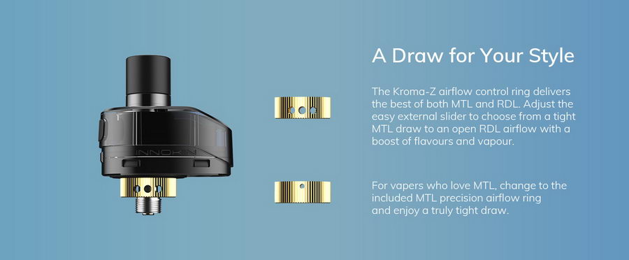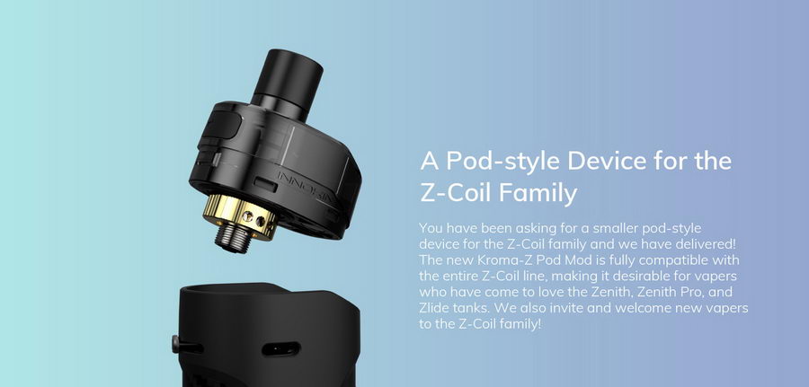 Innokin Kroma Z 3000mAh VW POD. Nakon fenomenalnog uspeha Zenith i Zlide atomizera koji koriste fabričke glave, Innokin nam sada predstavlja Kroma Z POD, sa integrisanom baterijom od čak 3000mAh, koja najbolje osobine ovih atomizera spaja u komplet veoma prijatnog izgleda.