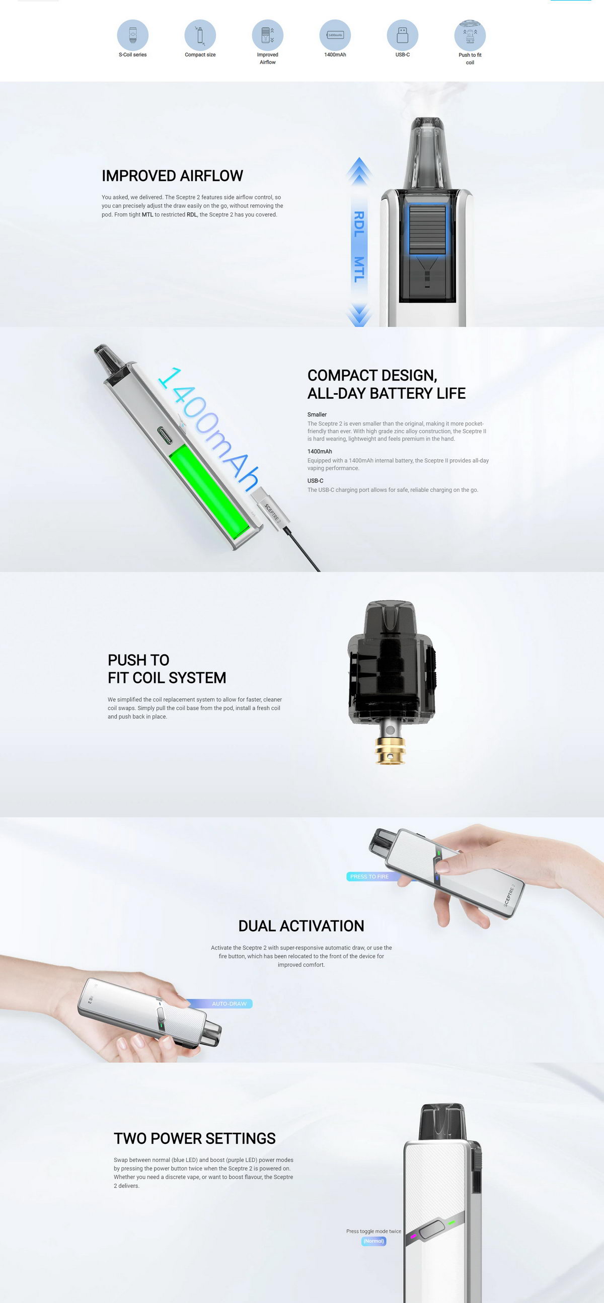 Naslednik popularnog Sceptre POD modela je sačuvao ono najbitnije: bateriju od čak 1400mAh i S Coil zamenske glave. Sistem za podešavanje protoka vazduha je unapređen, punjenje tanka i zamena grejača su ovde osetno jednostavniji, a prekidač je na boljoj poziciji.