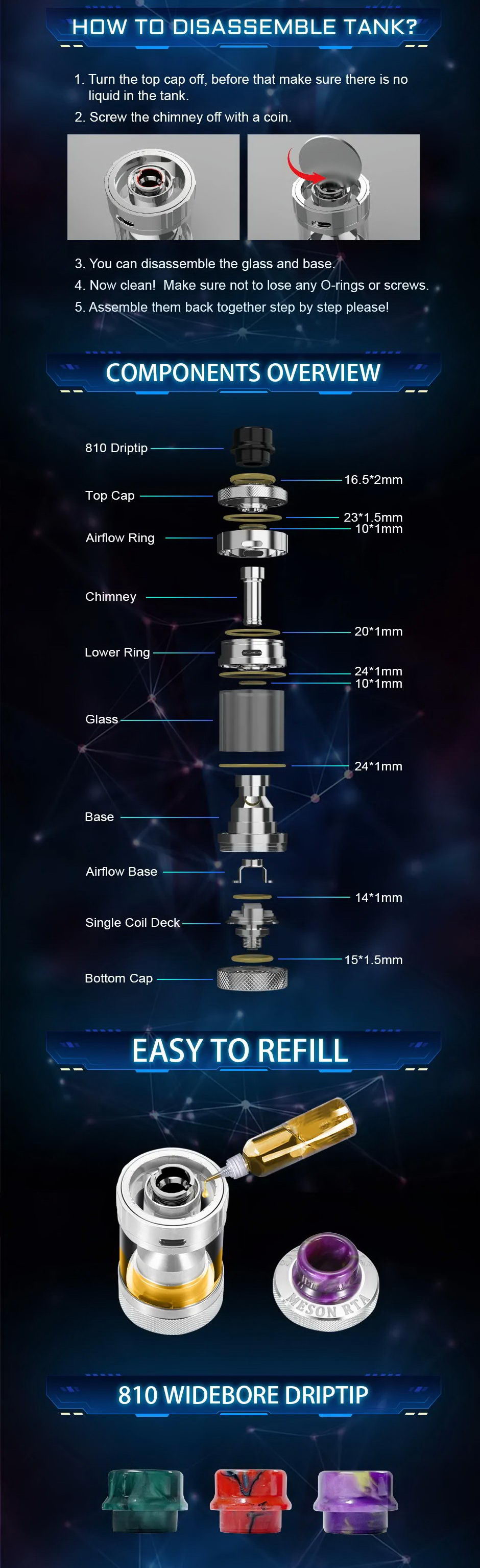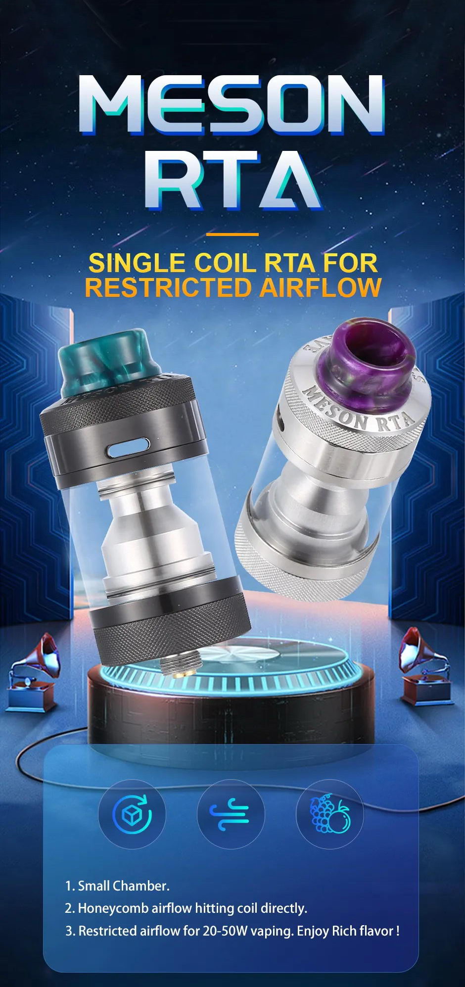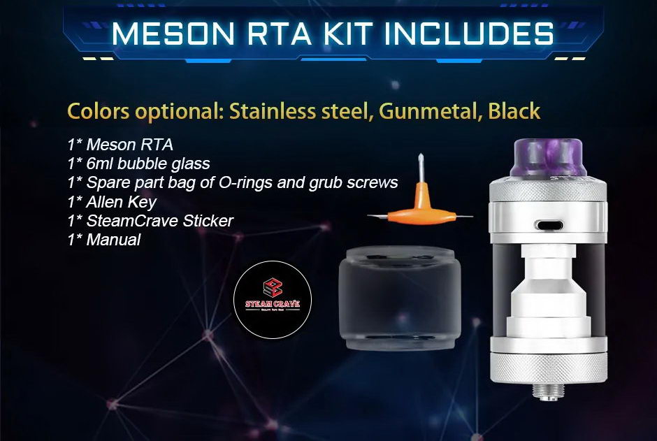 Meson je novi DTL atomizer iz kompanije Steam Crave. Predviđen je za Single Coil grejače a kapacitet tanka je 5ml (6ml sa Bubble tankom).