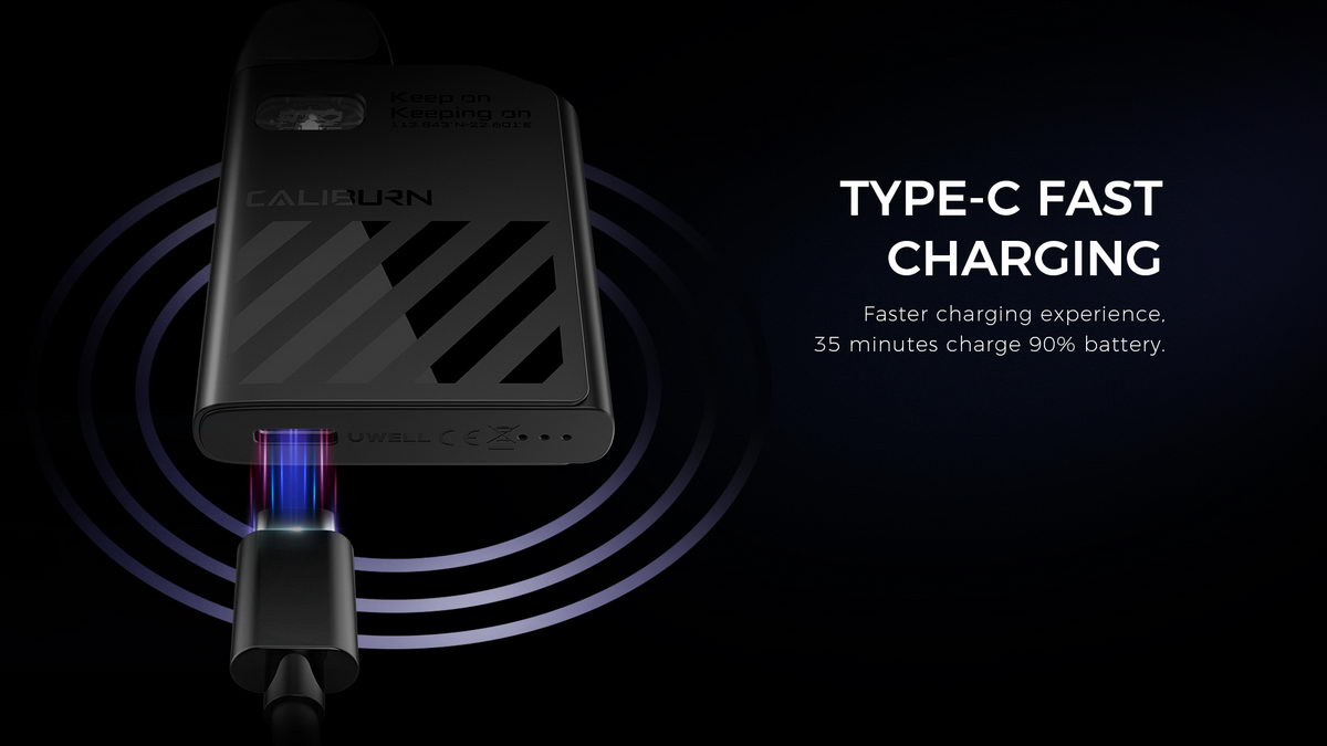 Baterija u Caliburn AK2 modelu je ista kao u prethodnom modelu, 520mAh. Punjenje se vrši preko usb kabla nove generacije, Tip-C. Prilikom punjenja, maksimalna dozvoljena struja je 1A!