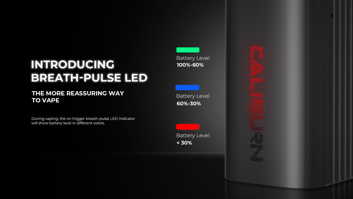 Na telu uređaja je svetleći natpis Caliburn koji služi kao indikator napunjenosti baterije. Zeleno svetlo označava da je baterija napunjena iznad 60%, plavo svetlo je za napunjenost od 30% do 60%, a kada je baterija napunjena manje od 30% svetlo je crveno.