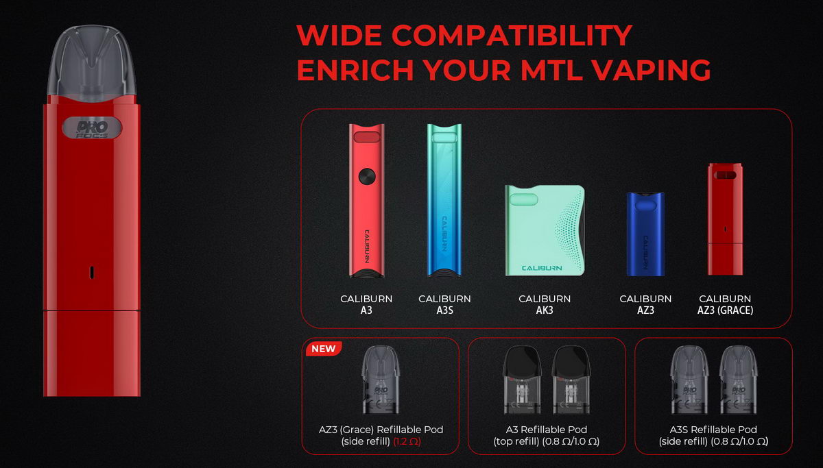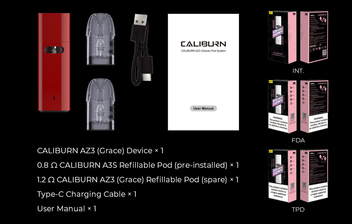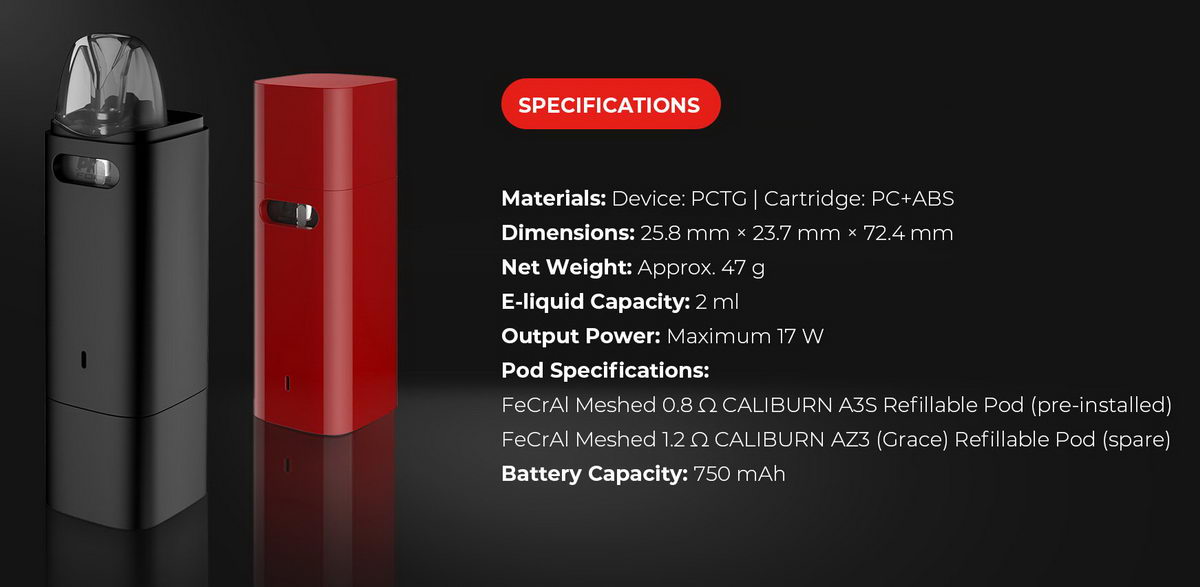 Caliburn AZ3 Grace je nova POD e-cigareta kompanije Uwell. Predstavljena je kao deo ZEGA kolekcije koju čine podovi novog dizajna, sa ciljem da se u što manjem pakovanju smeste što bolje performanse. Lice AZ3 pod e-cigarete je zaista malih dimenzija, a u njoj je baterija od čak 750mAh. Kao i kod prethodnih modela, i ovaj model donosi maksimalno lako korišćenje i fenomenalnu aromu. AZ3 koristi Caliburn kertridže nove generacije dostupne u više varijanti, za još bolje korisničko iskustvo.