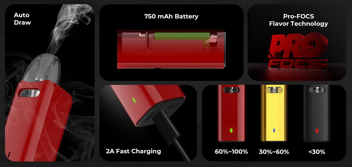 Baterija u Caliburn AZ3 Grace POD e-cigareti je kapaciteta 750mAh. Punjenje se vrši preko usb kabla nove generacije, Tip-C. AZ3 ima podršku za brzo punjenje i maksimalna podržana struja je 2A, ali se za duži životni vek baterije i očuvanje njenog kapaciteta preporučuje punjenje na struji manje snage.