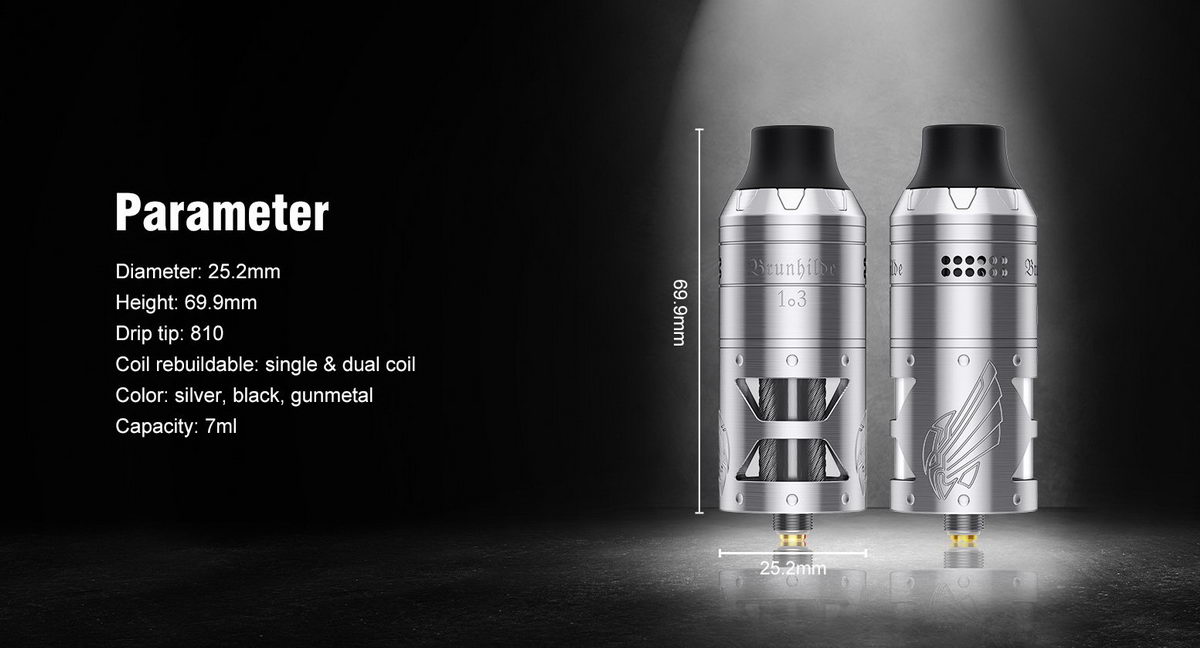 Brunhilde 1o3 RTA je masivan atomizer, visokog kvaliteta izrade. Tank se puni slično kao kod prethodnih Brunhilde atomizera, preko otvora na boku uređaja. Ovde je na otvor postavljen ventil, kao dodatna sigurnost protiv curenja. Kapacitet tanka je 7ml.