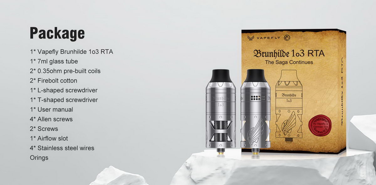 1o3 je novi model iz Brunhilde kolekcije uređaja napravljenih u saradnji kompanije Vapefly i nemačke vaperske organizacije German 103. Brunhilde atomizeri su već godinama među najpopularnijim na svetskom tržištu pa su Vapefly i German 103 na jednom mestu sakupili sva dobra i loša iskustva korisnika, te kreirali Brunhilde 1o3 RTA koji je trenutno najfleksibilniji atomizer u ponudi.