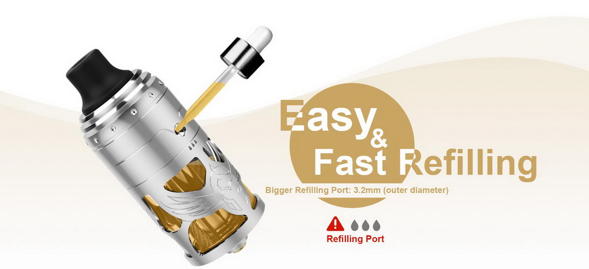 I punjenje tanka je rešeno na interesantan način, na boku je rupa do koje se dolazi okretanjem kape atomizera. Nakon što napunite, pomerite kapu u stranu i atomizer je spreman za upotrebu.