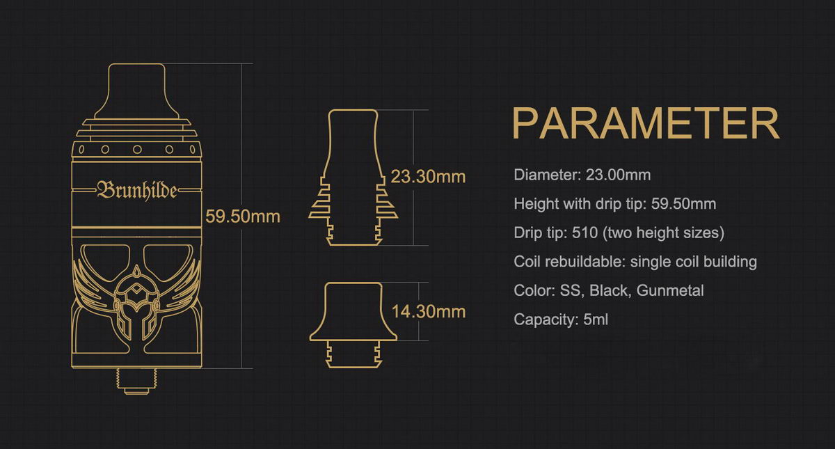 Brunhilde MTL RTA je atomizer visokog kvaliteta izrade. Na prvi pogled je očigledno da je nastao u saradnji sa ekipom vapera iz Nemačke, dizajn je arhaičan i vidljiva je germanska nota. Osnovna inovacija koju Brunhilde MTL RTA donosi su sajle od najkvalitetnijeg nemačkog čelika, kojima se tečnost fantastično brzo i precizno dovodi iz relativnog visokog tanka do komore grejača.