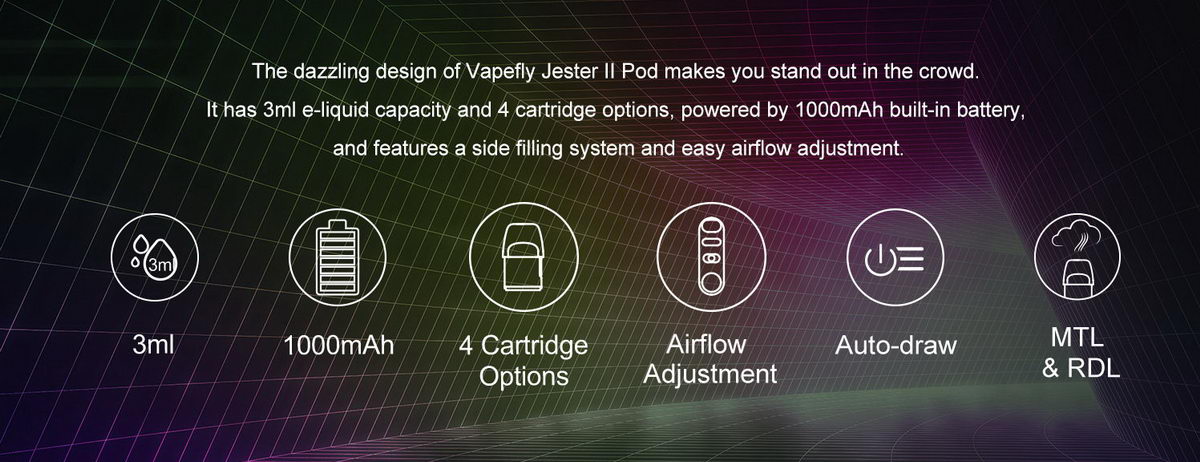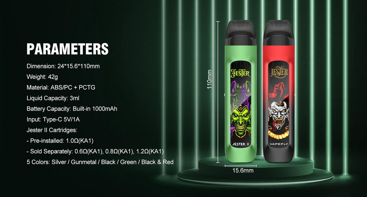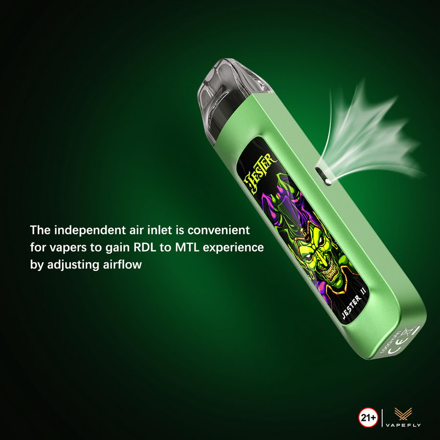 Nakon što je Manners R POD e-cigareta ostavila sjajan utisak i doživela veliku popularnost među korisnicima, Vapefly nam predstavlja novi model pod nazivom Jester II. Funkcionalno gotovo identičan Manners R modelu, samo u drugačijem obliku, Jester II korisniku nudi sve što je potrebno za kompletan užitak: bateriju dovoljno velikog kapaciteta, tank od čak 3ml, mogućnost podešavanja protoka vazduha. Dostupna su četiri modela zamenskih kertridža, pa svako može pronaći za sebe idealnu opciju.