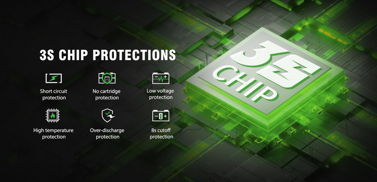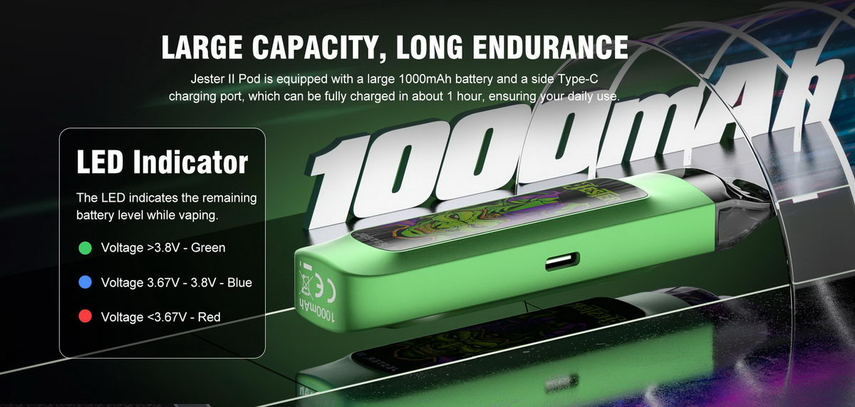 Jester II pokreće integrisana baterijska ćelija kapaciteta 1000mAh. Za rad uređaja je zadužen Vapefly 3S elektronski čip, koji garantuje preciznost i stabilan rad. Ne postoji mogućnost podešavanja izlazne snage, čip je isprogramiran da isporučuje optimalnu snagu u skladu sa tim koji model kertridža je u uređaju. Na licu uređaja je mala led lampica koja služi kao indikator napunjenosti baterije.