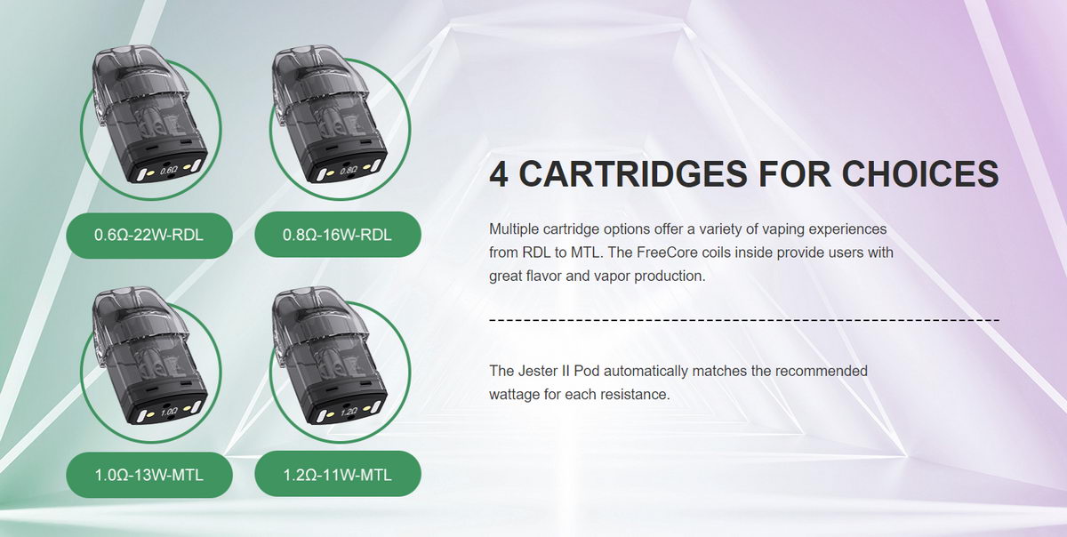 Ketridž je magnetima pričvršćen za bateriju uređaja. Kapacitet tanka je 3ml, a u kertridž je integrisan grejač. Za Jester II su dostupni sledeći modeli kertridža:
