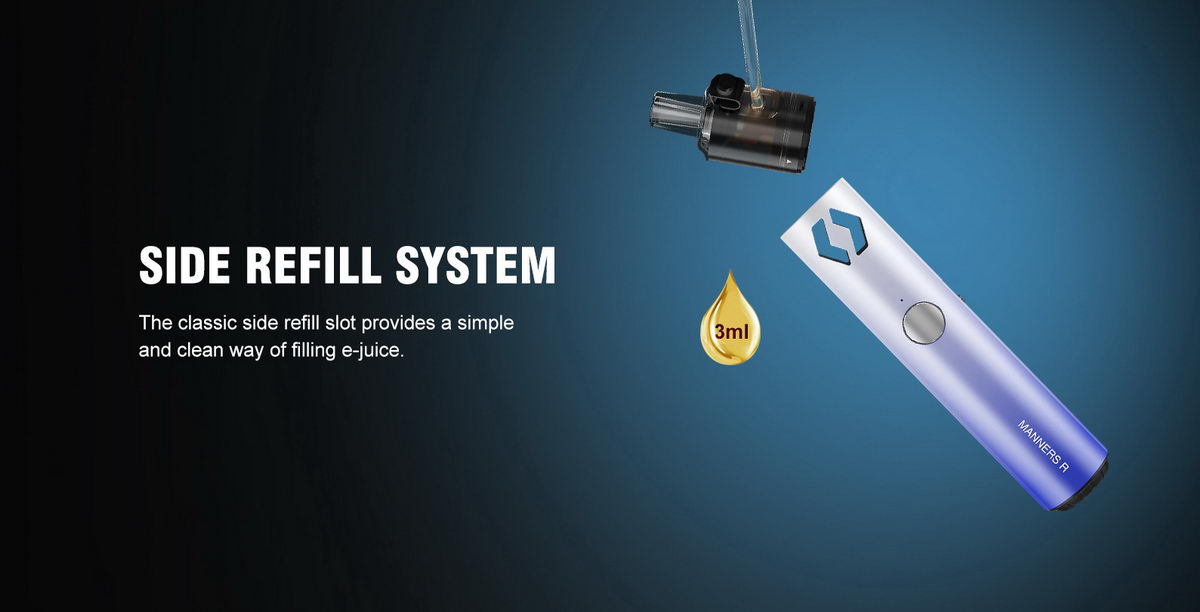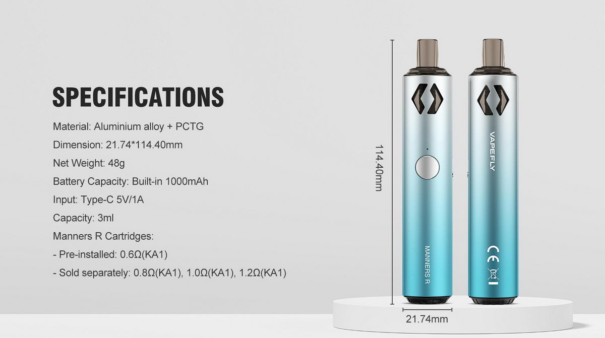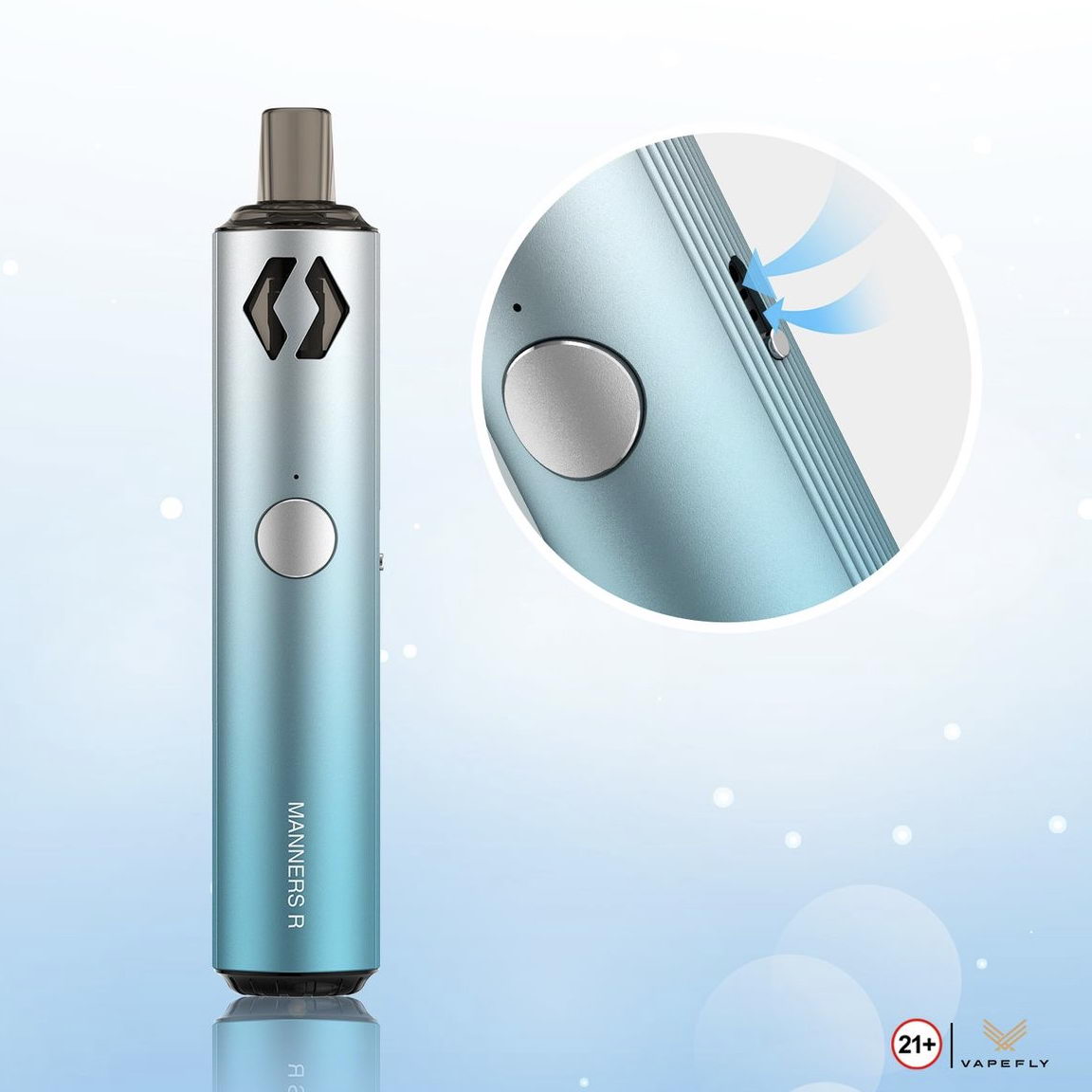 Manners R je sjajan POD uređaj kompanije Vapefly. Iako malih dimenzija, ovaj model poseduje sve što je potrebno za kompletan užitak: bateriju dovoljno velikog kapaciteta, tank od čak 3ml, mogućnost podešavanja protoka vazduha. Dostupna su četiri modela zamenskih kertridža, pa svaki korisnik može pronaći za sebe idealnu opciju.