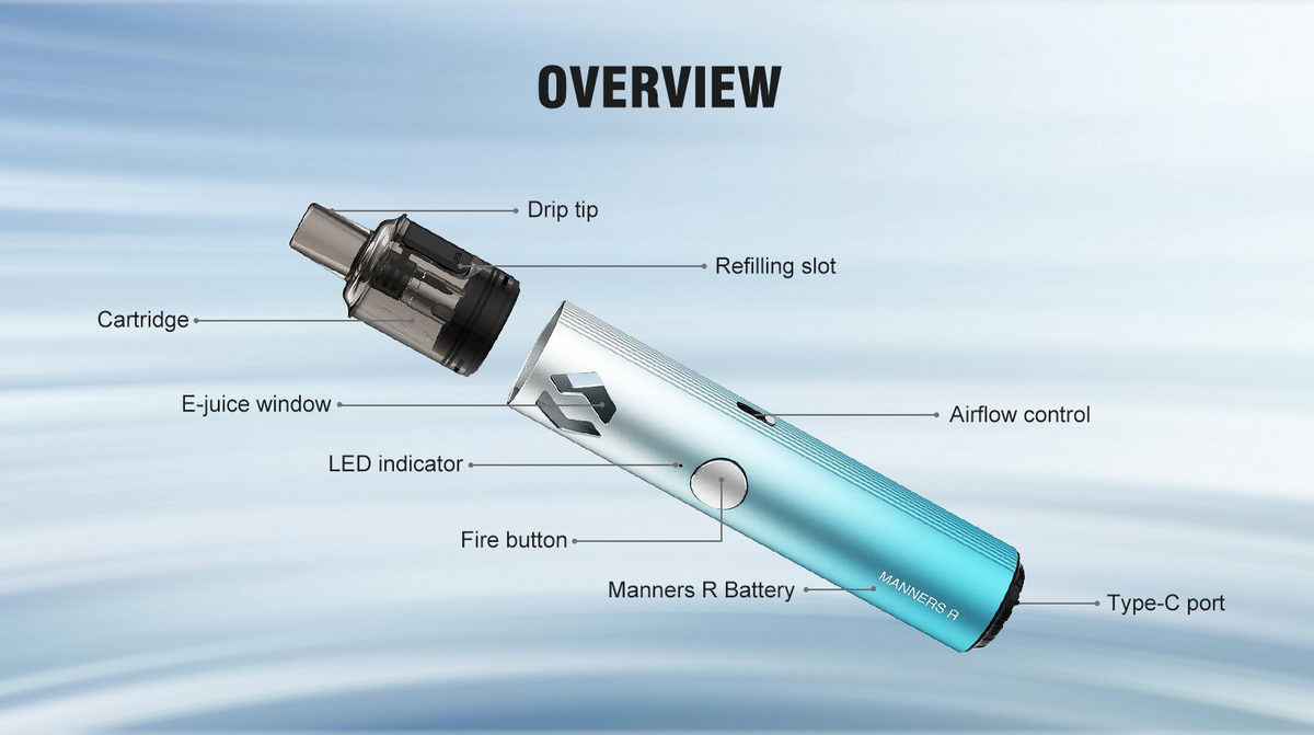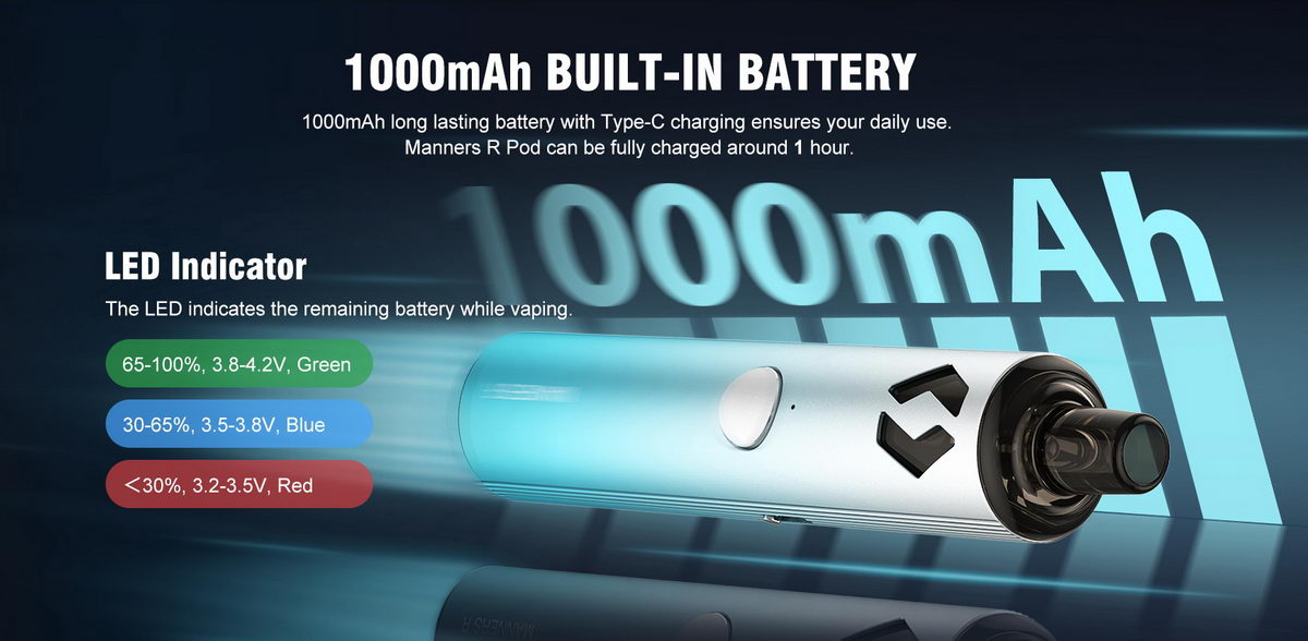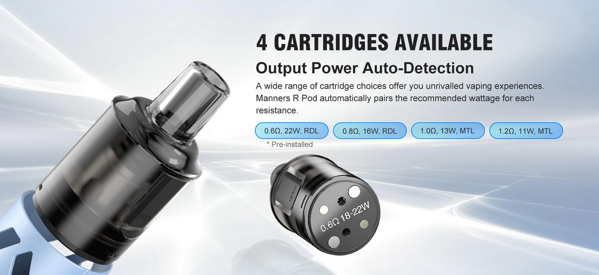 Manners R je jedan od najkompletnijih modela malih POD uređaja u našoj ponudi. Tu je baterija dovoljno velikog kapaciteta, mogućnost podešavanja protoka vazduha, dostupna 4 modela zamenskih kertridža... sve što je korisniku potrebno za kompletan užitak.