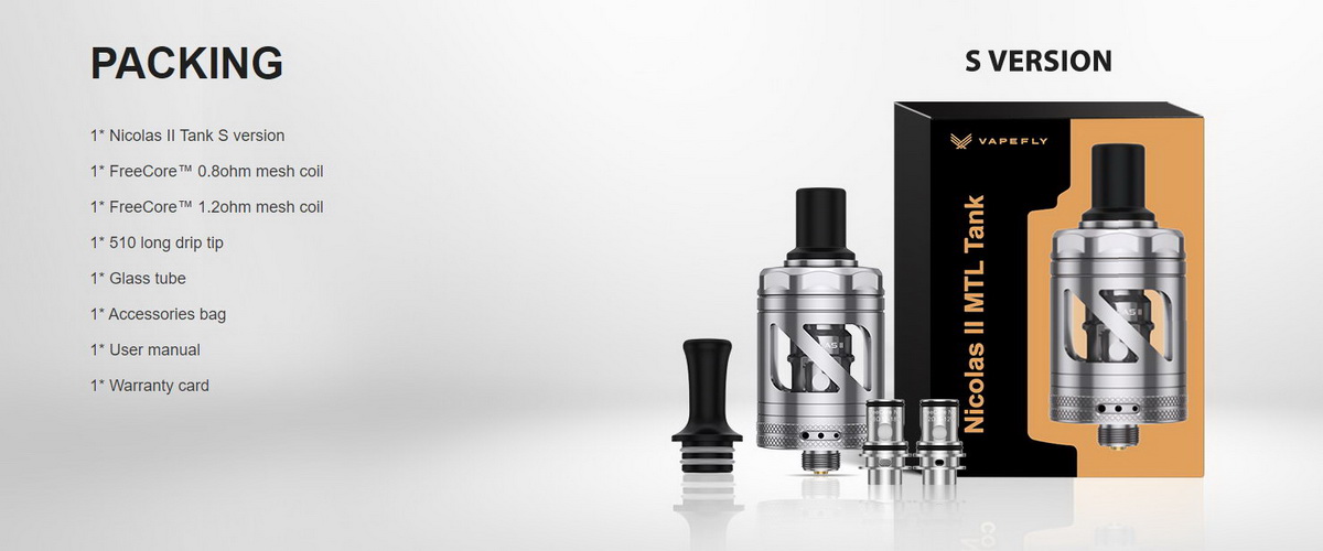 Prvi Nicolas model je godinama bio jedan od najpopularnijih MTL atomizera sa fabričkim glavama. Sada nam Vapefly predstavlja njegovog naslednika, Nicolas II, u dve varijante: S Version i G Version. Razlike su samo u vizuelne, funkcionalnost i kapacitet tanka su identični kod obe verzije.