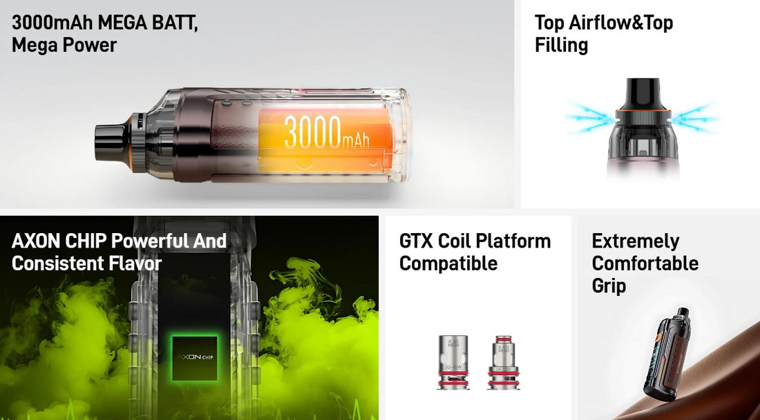 Novi model e-cigarete kompanije Vaporesso kompaktnog izgleda i vrhunskih performansi. Baterija je kapaciteta 3000mAh a kertridži su kapaciteta 5ml, koristi popularne GTX zamenske glave dostupne u nekoliko varijanti, što garantuje užitak svakom korisniku.