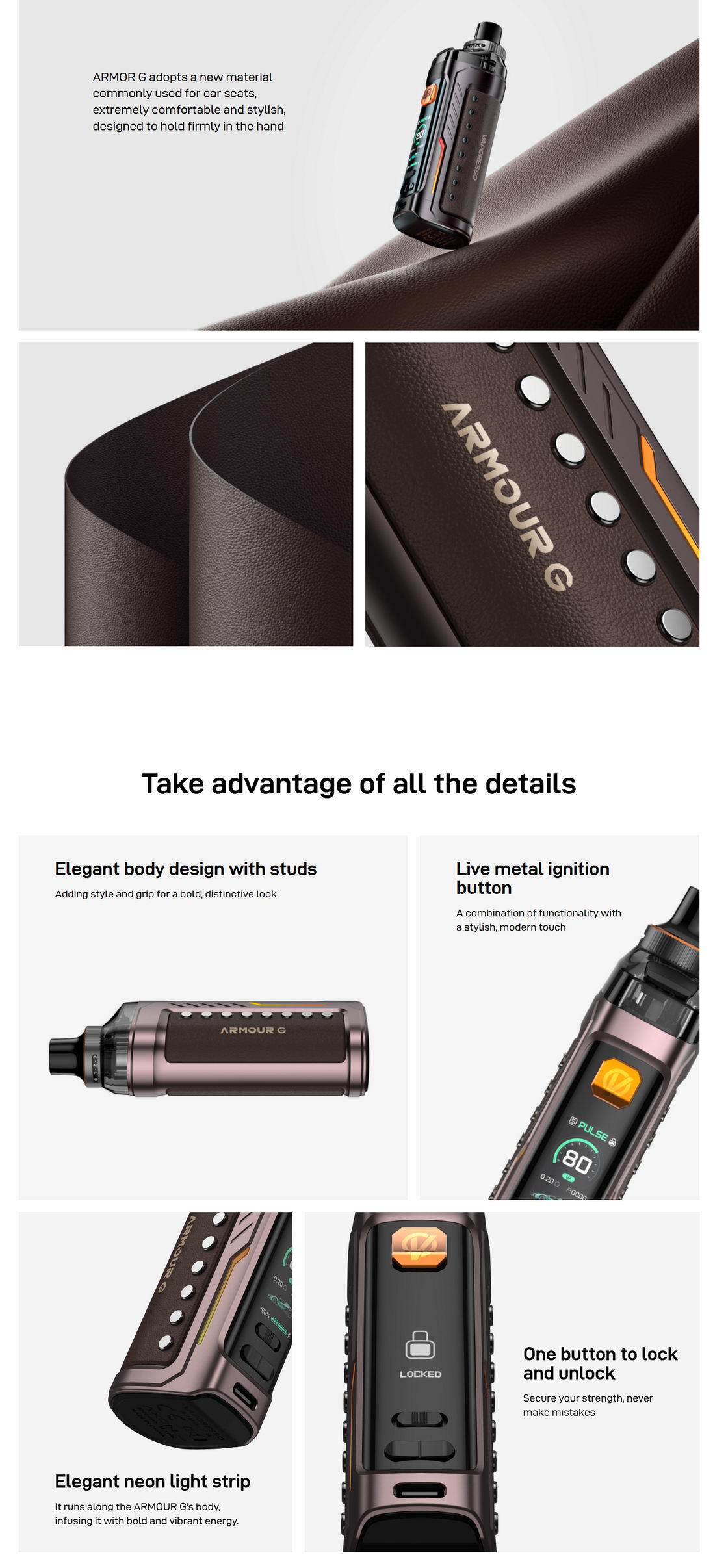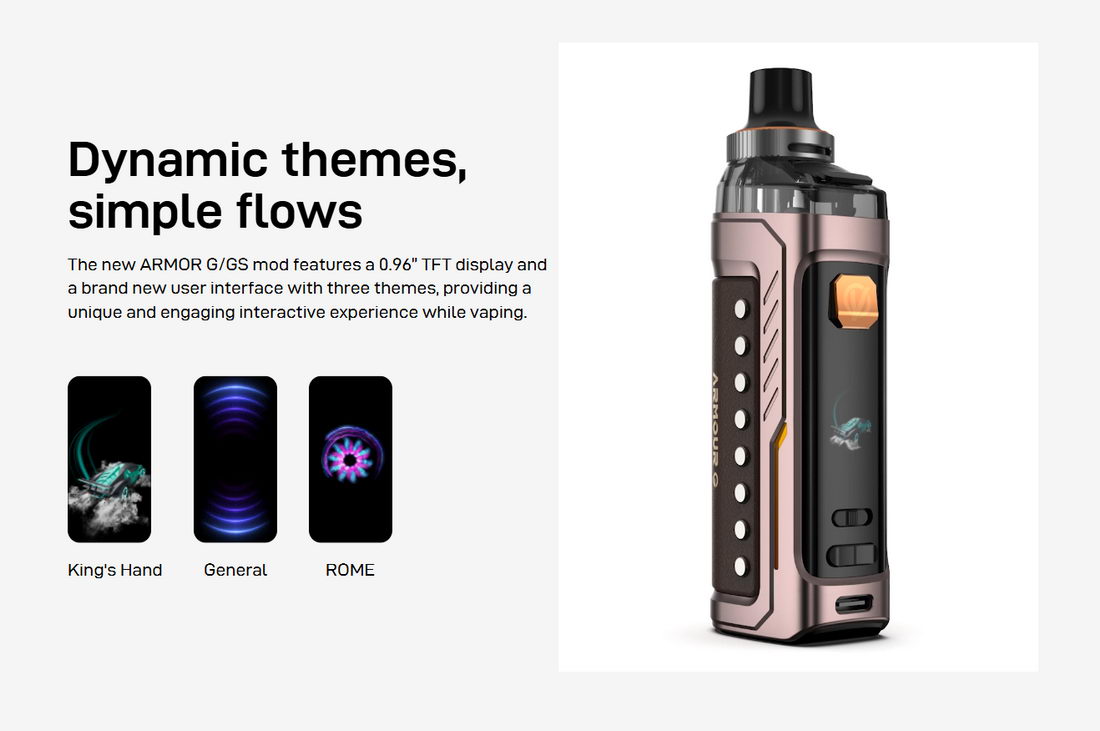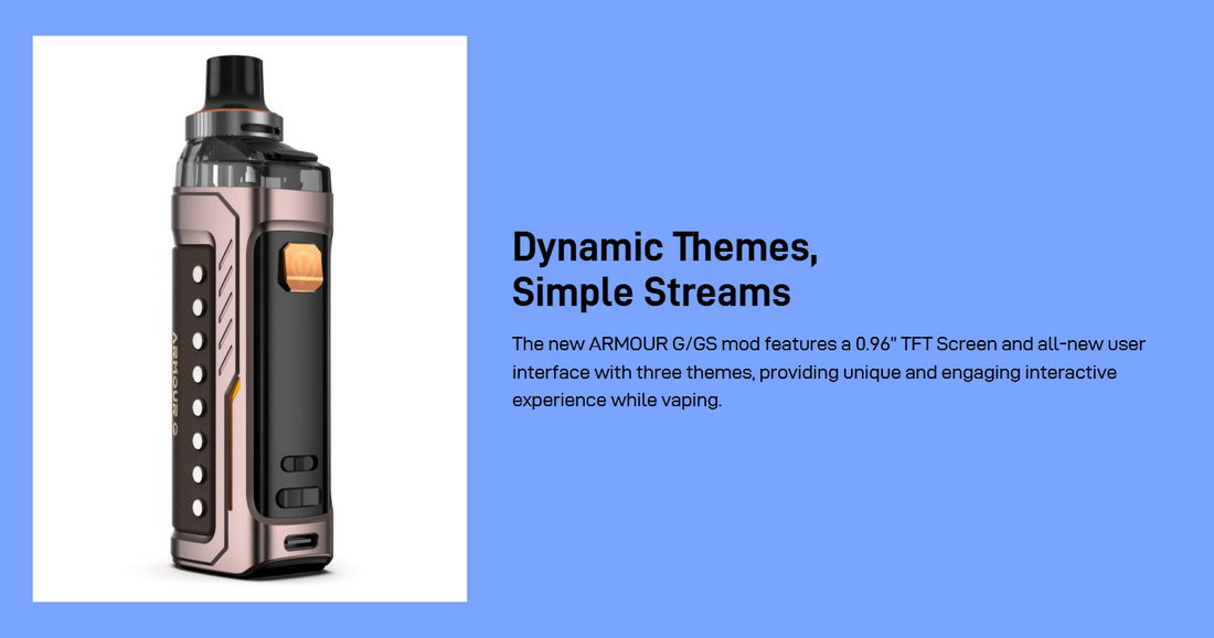 Armour G i Armour GS su namenjeni bukvalno svim kategorijama korisnika. Iako se u G verziji dobija MTL kertridž a u GS verziji je DTl kertridž, zamenom kertridža i postavljanjem zamenske glave odgovarajućeg otpora - i DTL korisnici mogu koristiti Armour G, isto kao MTL korisnici Armour GS. Usnik na kertridžu je izmenljiv.