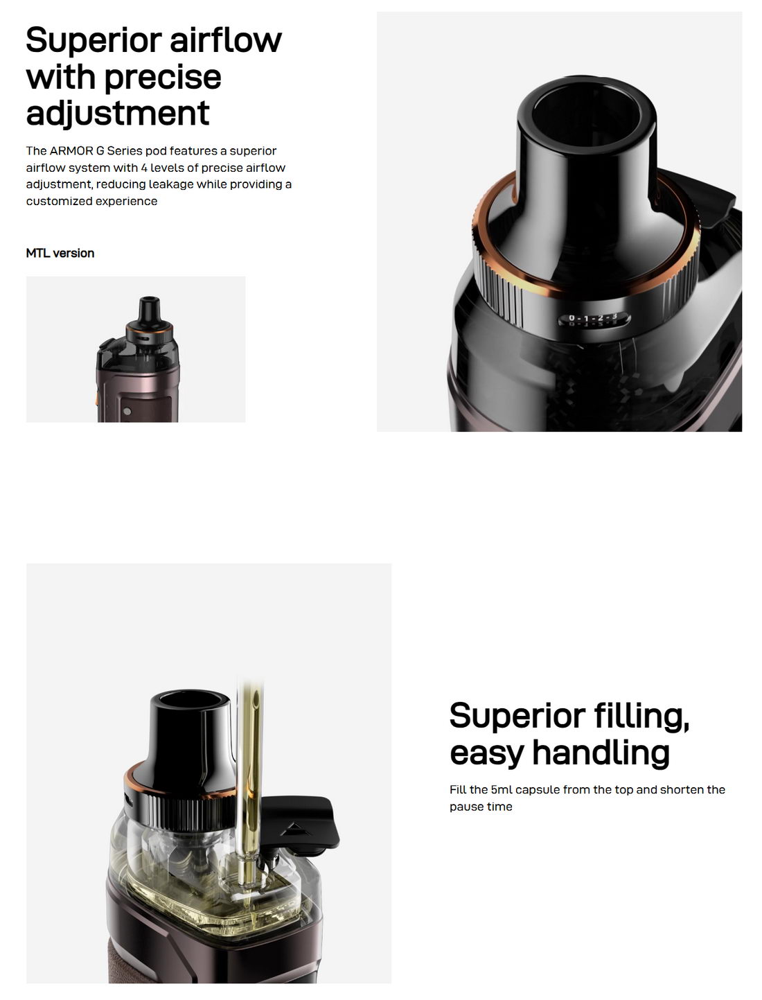 Kapacitet kertridža je 5ml, uz Armour G se fabrički dobija MTL verzija kertridža a uz GS dolazi DTL kertridž. Kertridži su izmenljivi i obe verzije (MTL i DTL) se mogu koristiti u oba Armour modela.
