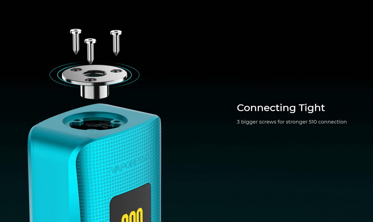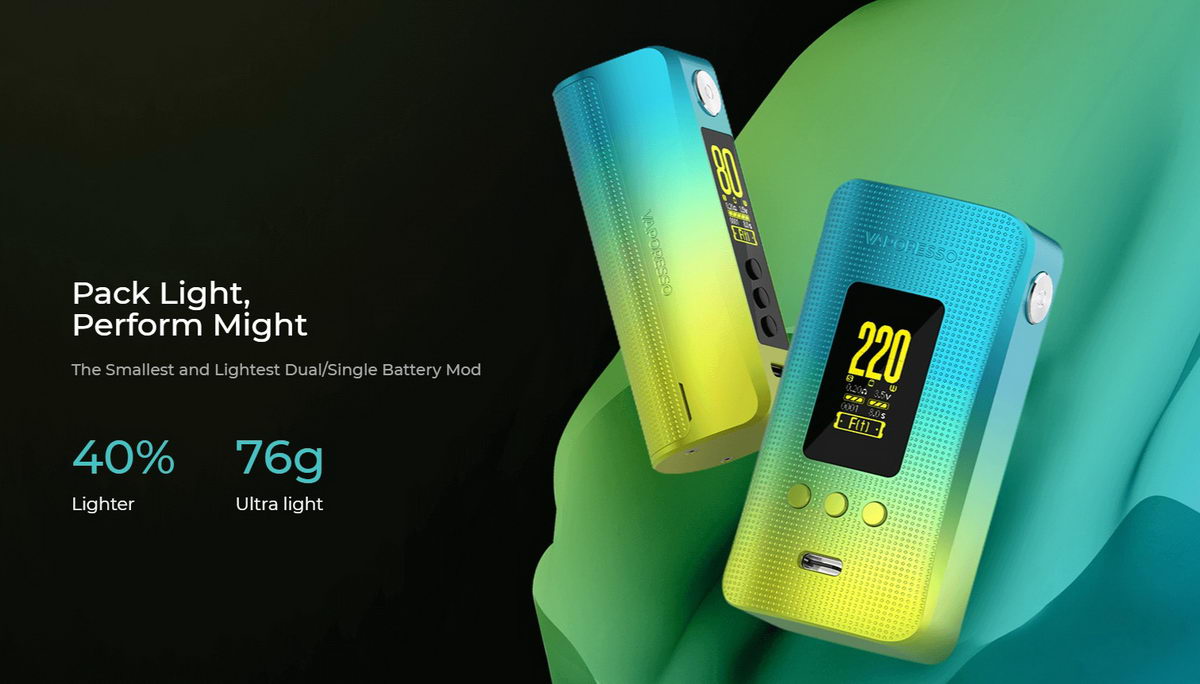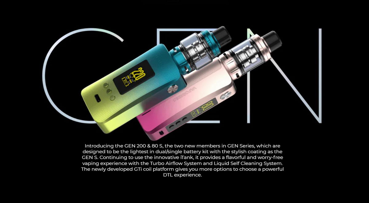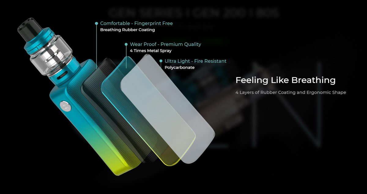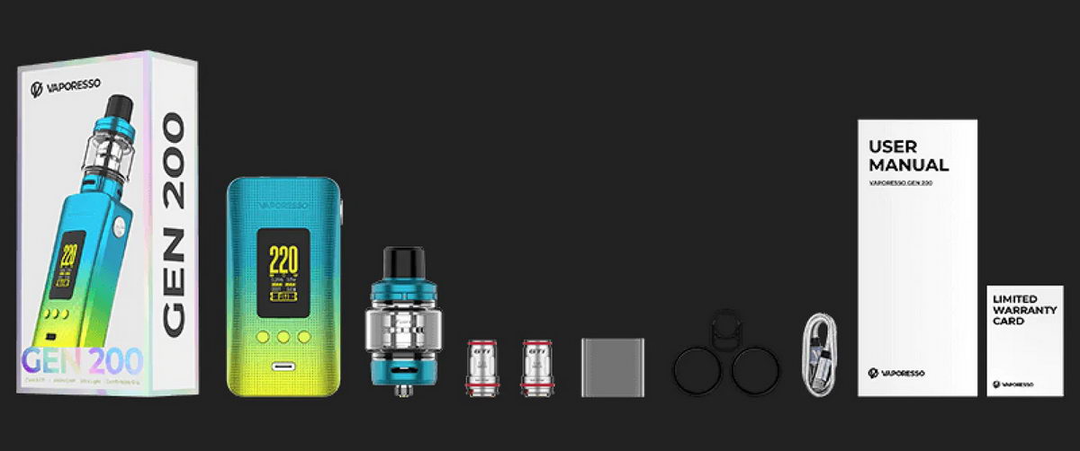 GEN 200 je novi model u GEN kolekciji baterijskih modova kompanije Vaporesso. Manjih dimenzija i lakši nego prethodnici, uz unapređenu verziju AXON elektronskog čipa, predstavlja sjajnu opciju za ljubitelje dual-18650 baterijskih modova. Uređaj je (bez baterija) težak samo 76 grama! Telo ovog baterijskog moda je presvučeno sa 4 zaštitna sloja, uključujući i sloj sa vatrostalnim polimerom, što ga čini znatno bezbednijim i otpornijim na habanje. Ovako lagan i sa hrapavim bočnim stranama, veoma lepo leži u ruci i prijatan je za korišćenje. Na ekranu od 0.96 inča su prikazani svi parametri bitni za rad samog uređaja.