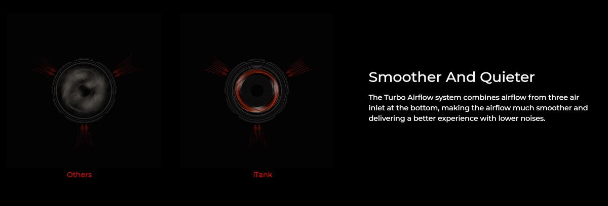 Itank karakteriše novi sistem protoka vazduha nazvan Turbo Airflow, koji vazduh ravnomerno distribuira po celoj površini grejača. Rezultat je ravnomernija i intezivnija aroma, uz duže trajanje samih zamenskih glava.
