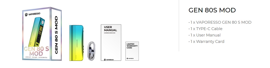 GEN 80S je novi model u GEN kolekciji baterijskih modova kompanije Vaporesso. Predstavlja manju verziju GEN 200 modela sa kojim deli istu, unapređenu verziju AXON elektronskog čipa. Stoga je GEN 80S sjajna opcija za korisnike single-18650 baterijskih modova.