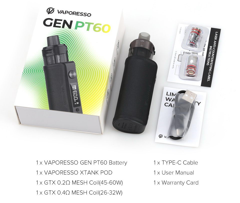 MOD-POD e-cigareta iz kompanije Vaporesso, interesantnog dizajna i respektabilnih performansi. Koristi poznate GTX zamenske glave, baterija kapaciteta 2500mAh je integrisana. Vaporesso PT60 je model predviđen za korišćenje uvlačenjem direkt u pluća (DTL).