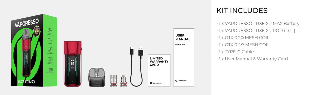 SADRŽAJ KOMPLETA: - Vaporesso Luxe XR Max 2800mAh VW POD e-cigareta sa praznim DTL kertridžom - Zamenske glave Vaporesso GTX: 0.2 oma, 0.4 oma - USB kabal Tip-C - Uputstvo